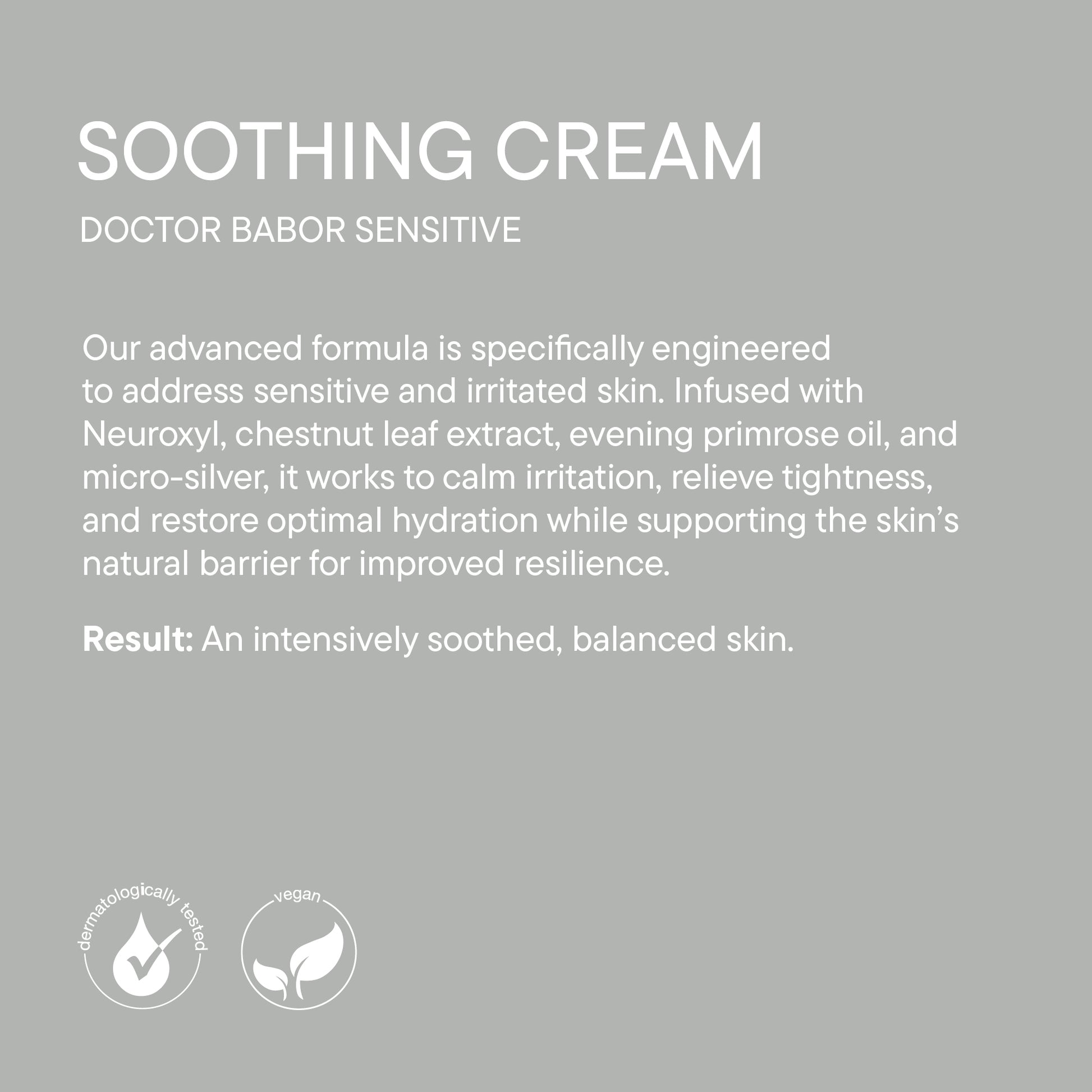 Apply to the face, neck and décolletage and gently massage in the morning and evening after cleansing with DOCTOR BABOR Soothing Cream Cleanser and preferably after DOCTOR BABOR Itch Relief Serum