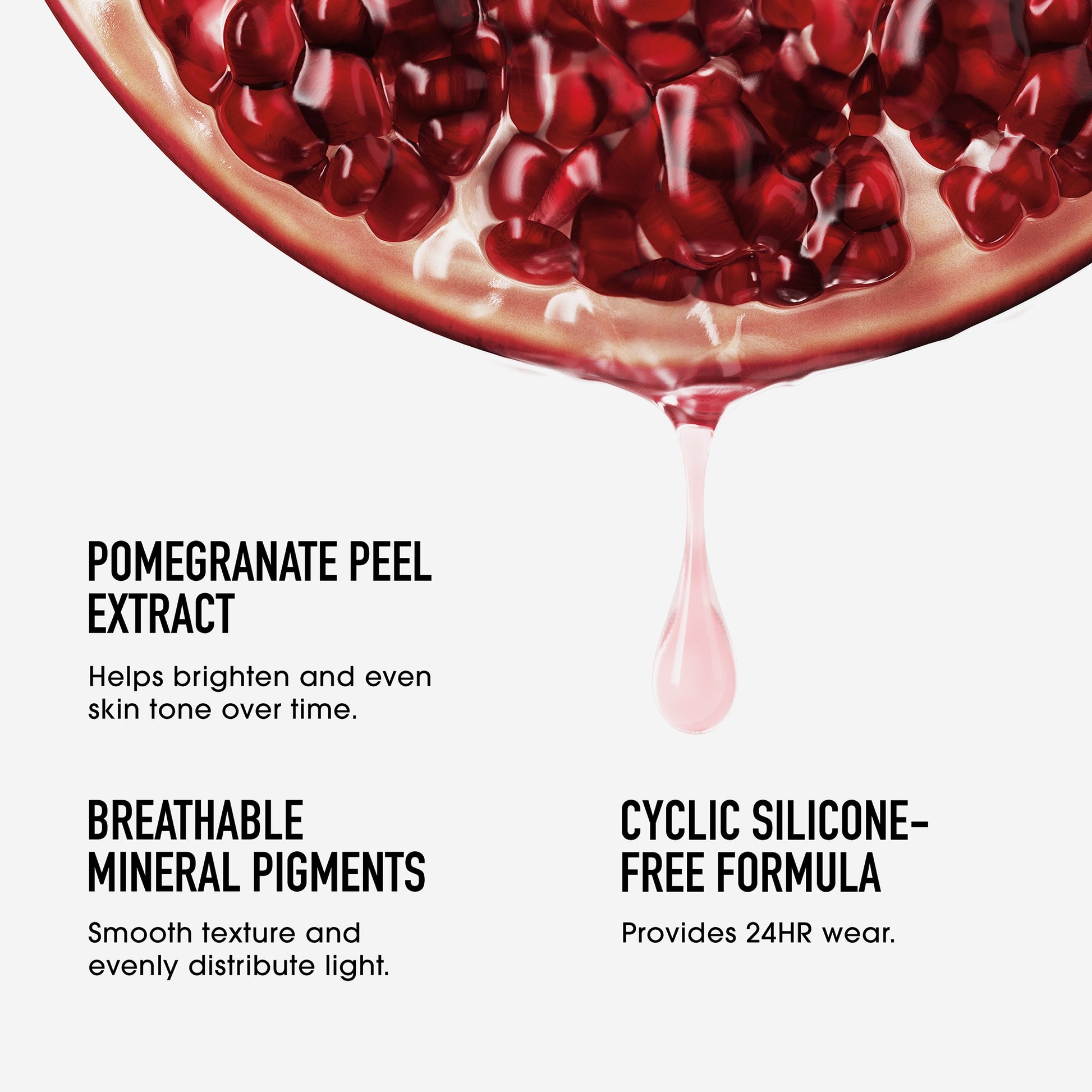 - Formulated with brightening upcycled Pomegranate Peel Extract and Mineral-based Powders to even skin's tone in 7 days.*