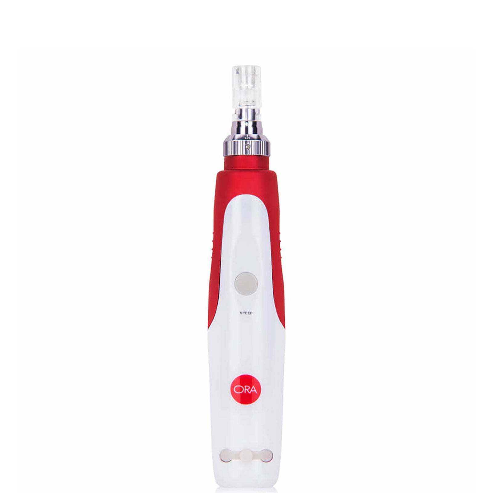 The ORA Electric Microneedle Derma Pen System takes the guesswork out of microneedling by producing controlled, precise needle strokes faster than a traditional roller. What makes this pen stand apart from the rest is the adjustable needle head (varying in length from 0.25 mm to 2 mm), and the built-in vibration mechanism that provides deeper needle penetration.