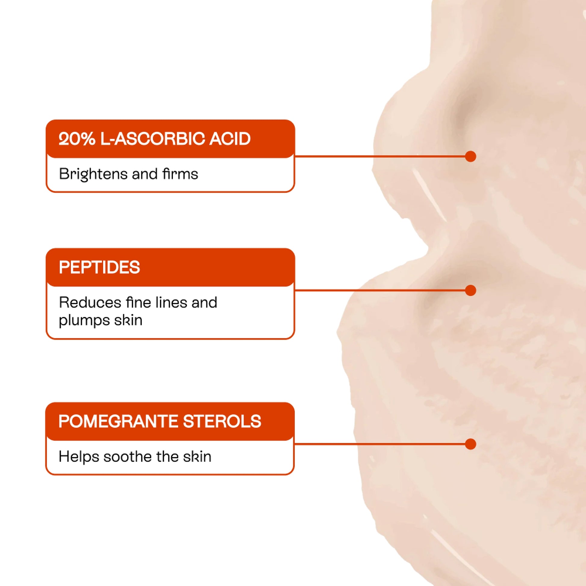 Advanced serum with NEW firming peptides reduces wrinkles, while 20% stable L-Ascorbic acid targets dark spots. Enhanced with hyaluronic acid, ceramides and pomegranate sterols for smoother, brighter skin.