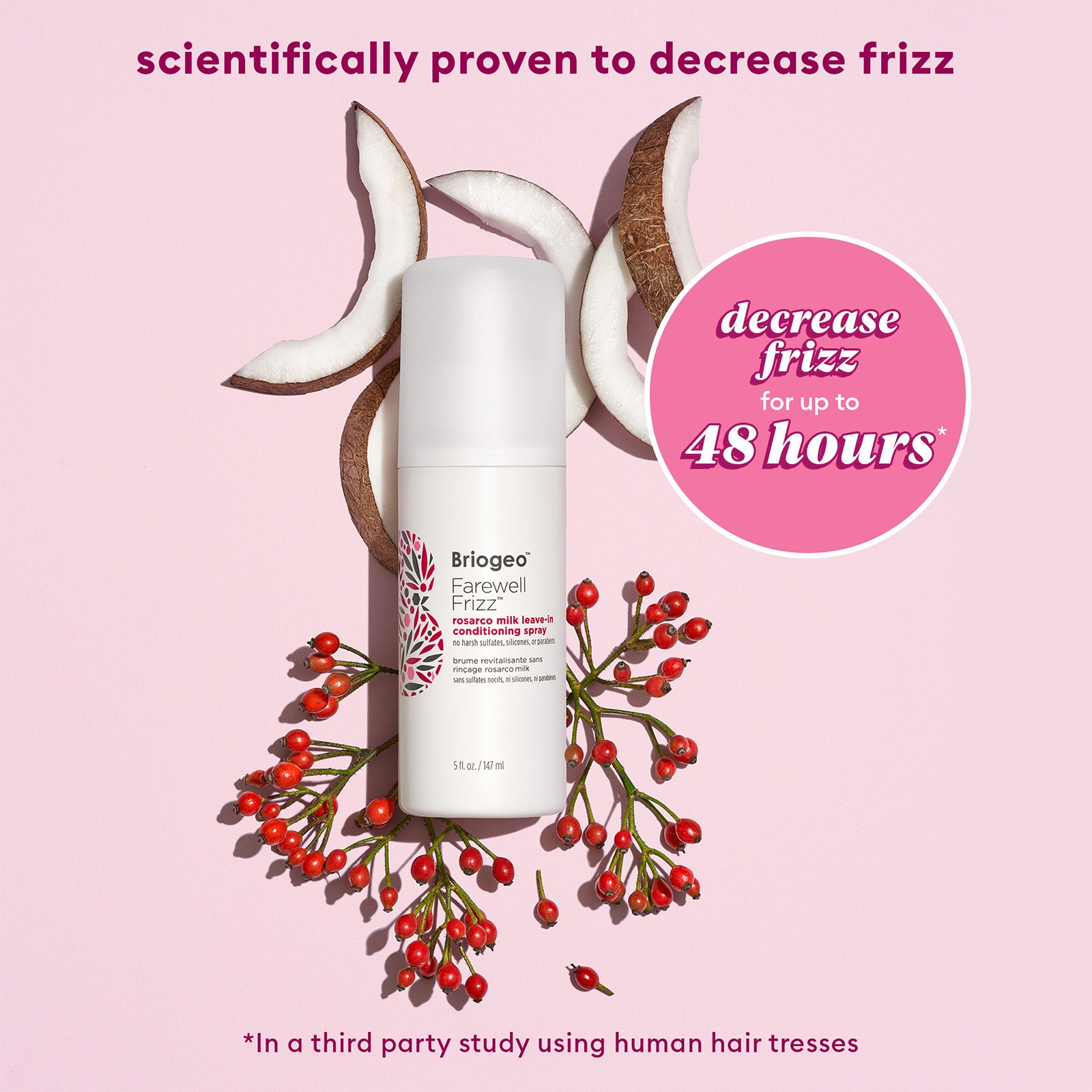 Farewell Frizz™ Rosarco Milk Leave-In Conditioning Spray from Briogeo is a lightweight, leave-in conditioning spray that boosts hydration and locks out humidity to minimize frizz, smooth hair, and add shine. Formulated with a nourishing blend of rosehip, argan, and coconut oils, this powerhouse oil trio helps seal the hair cuticle to reduce frizz and enhance smoothness, shine, and manageability while also nourishing and detangling hair right out of the shower.