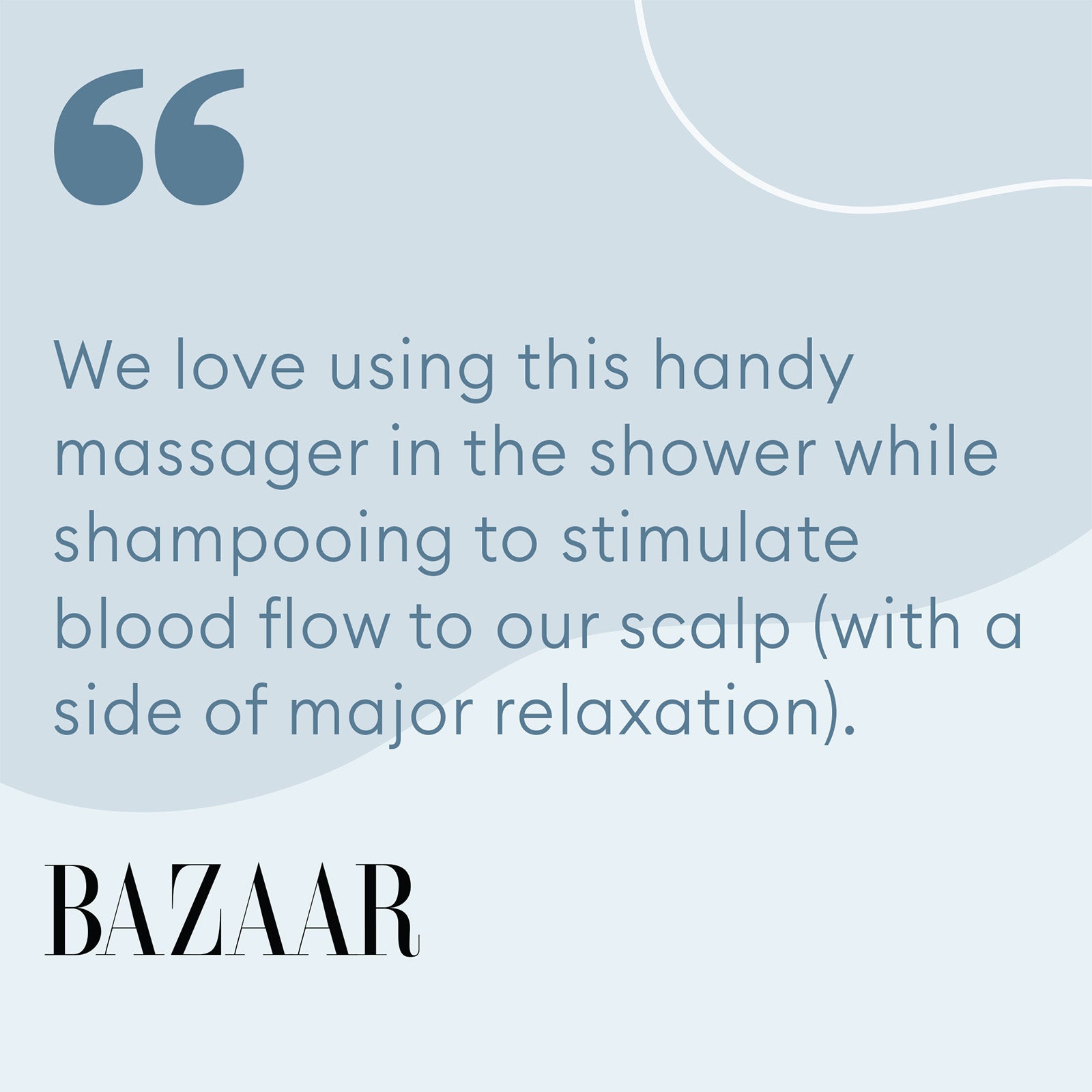 While holding the massager in your palm, gently press the rubber tips to the scalp with medium pressure and massage. Repeat on all areas of the scalp.