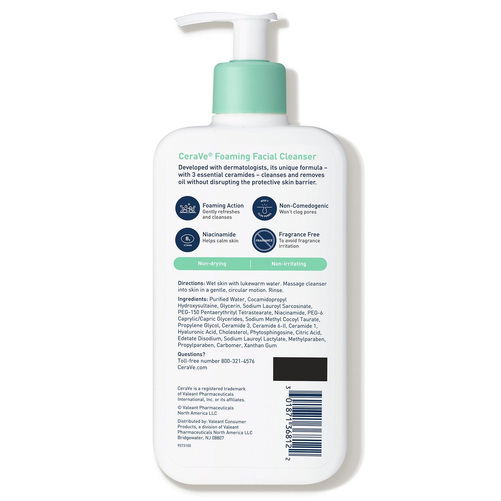 CeraVe Foaming Facial Cleanser gently removes dirt, excess oil and dead skin cells to reveal a clean, fresh face. The non-irritating formula maintains a healthy moisture balance, never stripping the skin, while eliminating shiny, oily areas. Replenishing hyaluronic acid and ceramides produce a healthy skin barrier so your face feels comfortable without any tightness or dryness.
