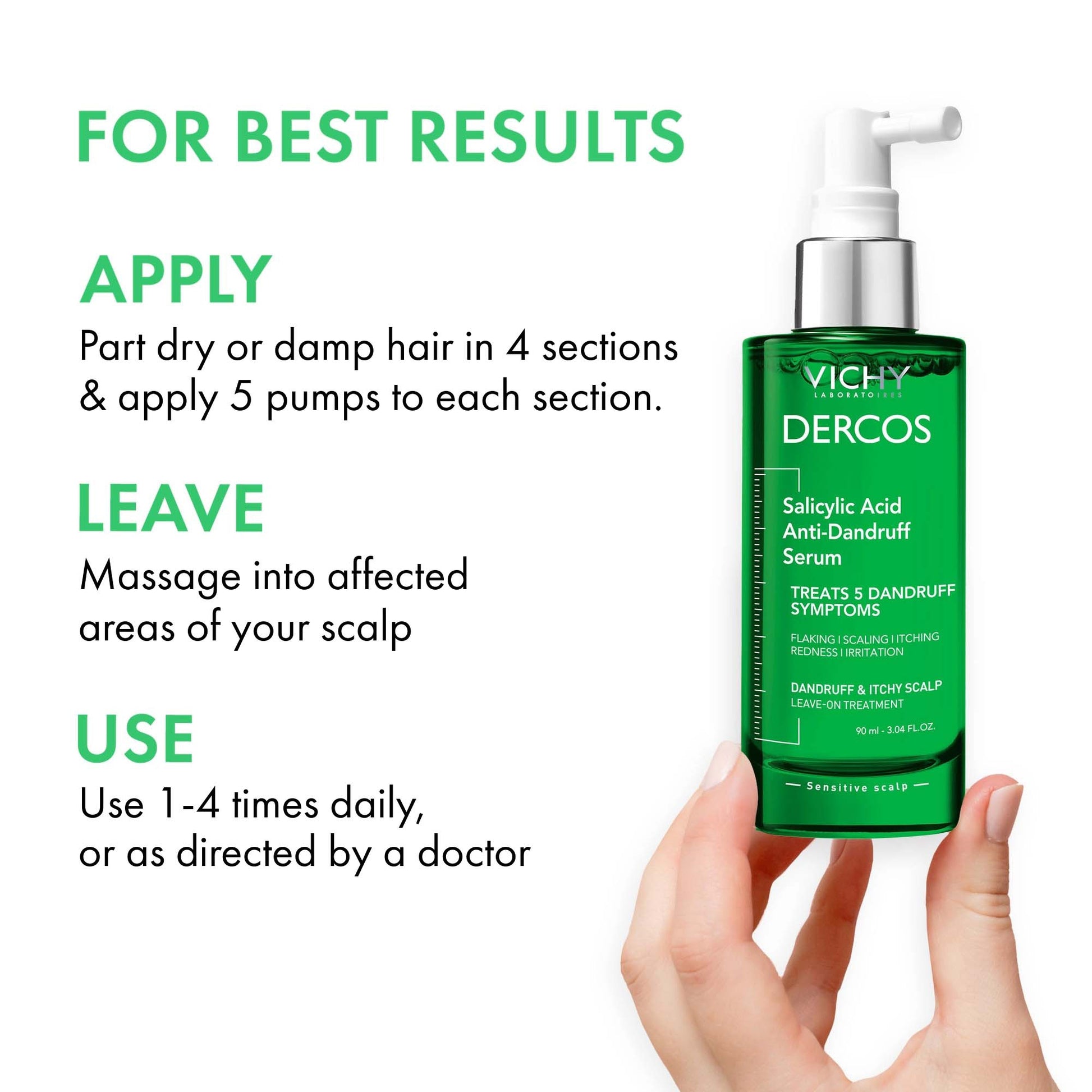 Treat and balance your scalp between washes with Dercos Salicylic Acid Anti-Dandruff Serum, fighting 5 dandruff symptoms-flakes, scales, itching, redness, and irritation-from the first use.