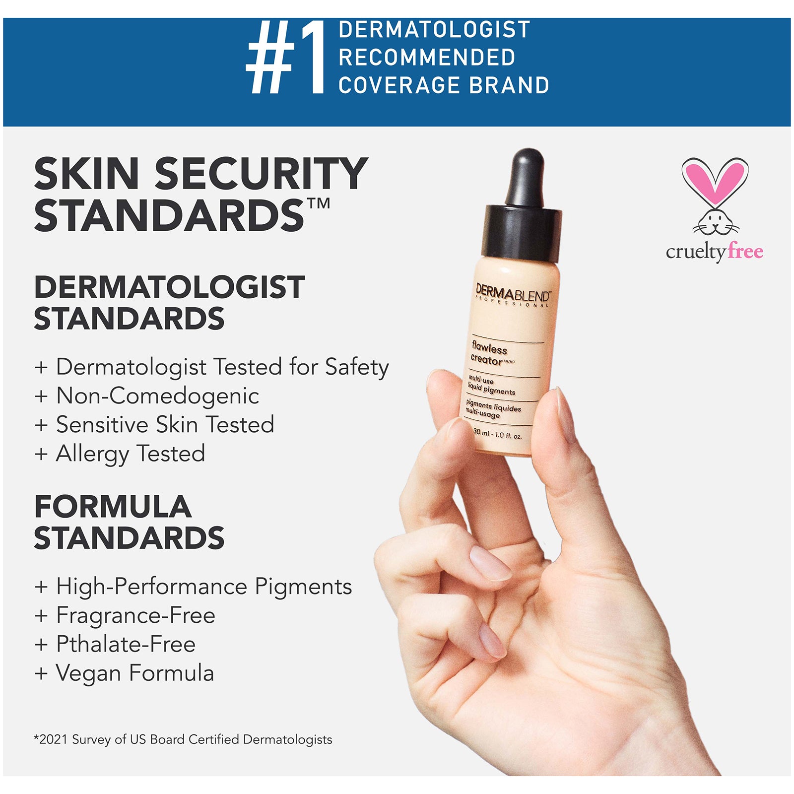 Dermablend Flawless Creator Liquid Foundation Drops are oil-free and non-comedogenic. Created by the #1 Dermatologist Recommended Coverage Brand, this full coverage foundation has 10 ingredients + high-performance pigments. It can be used alone or mixed with your skincare.