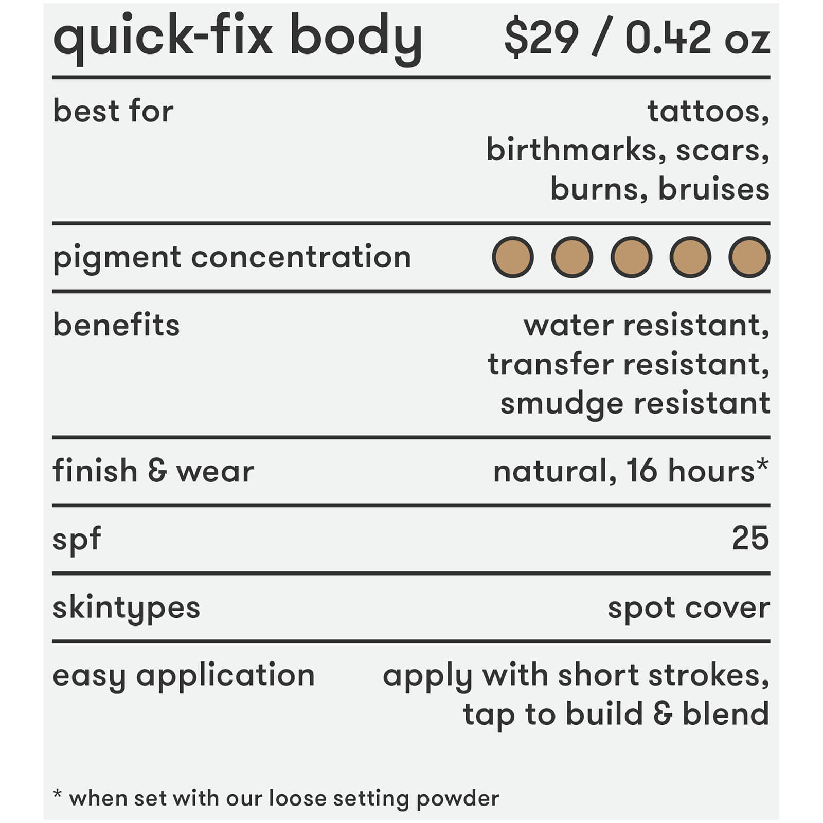Our quick-fix™ full coverage body makeup provides maximum coverage on-the-go for up to 16 hours of water, smudge, and transfer-resistant* color wear when set with our setting powder.