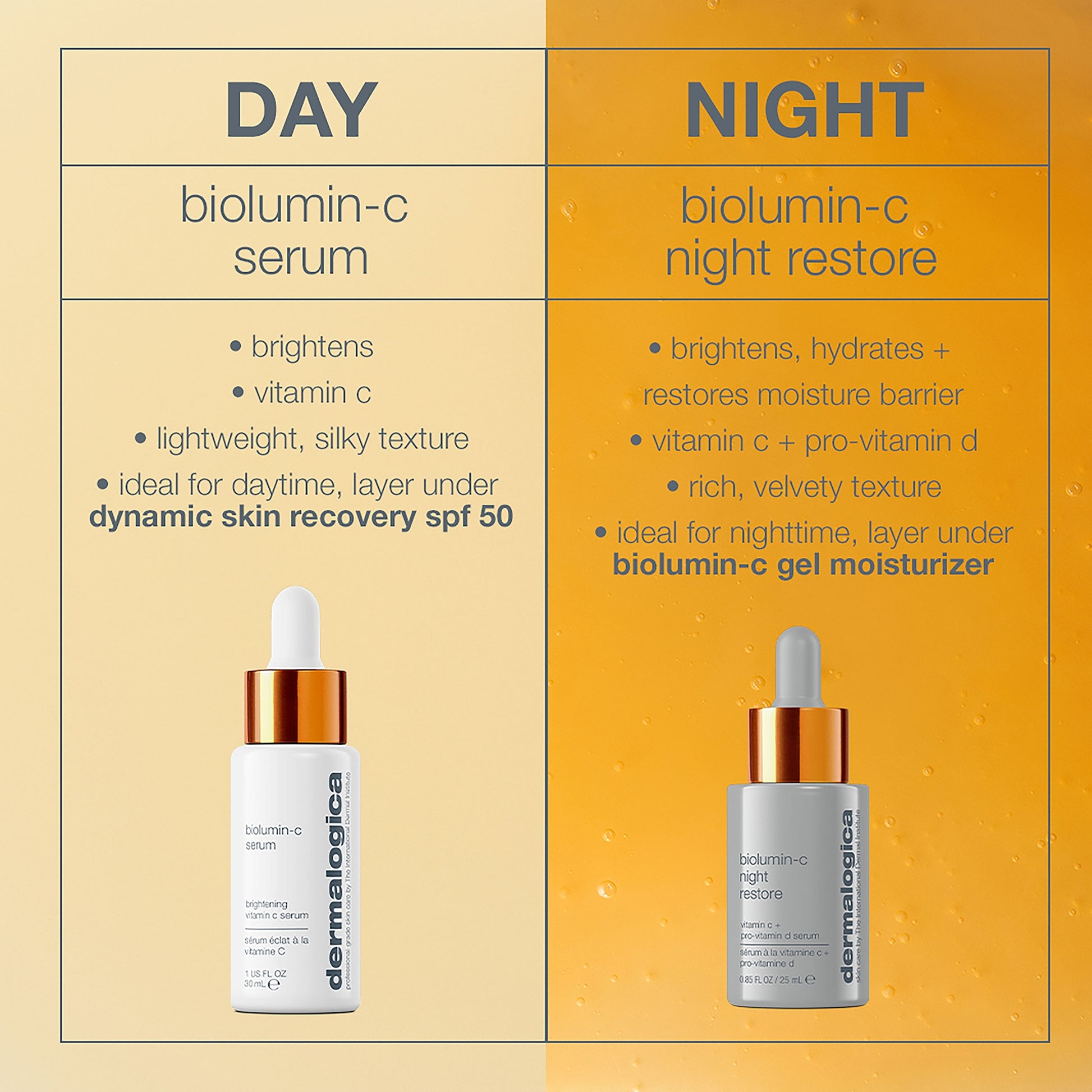 Dermalogica's BioLumin-C Night Restore is the serum that works the night shift. Formulated with ultra-stable Vitamin C and Pro-Vitamin D Complex, BioLumin-C Night Restore helps restore moisture barrier for long-lasting radiance, hydration, and improved tone overnight*. 100% showed lasting brightness + immediate hydration**. While you rest, this powerhouse serum helps to reverse daytime damage and support the skin's natural repairative mode.