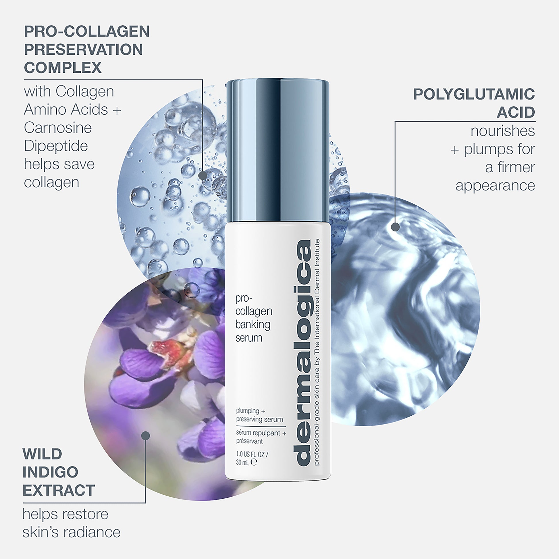 Dermalogica's Pro-Collagen Banking Serum helps promote, protect, and preserve skin’s collagen today, so you have more for tomorrow - supporting visibly plumper, more luminous skin and hydrating to help reduce the look of fine lines into the future. Powered by a Potent Pro-Collagen Preservation Complex that delivers an innovative blend of Collagen Amino Acids, Carnosine Dipeptide, and antioxidants, this formula helps save collagen by defending against collagen-degrading free radicals. Soothing Jojoba Ester and Polyglutamic Acid work to nourish the skin’s moisture barrier to visibly plump for a firmer appearance. Wild Indigo Extract and Arginine PCA help to restore skin’s radiance while Pink Carnation Flower Extract helps improve skin’s softness and overall resilience