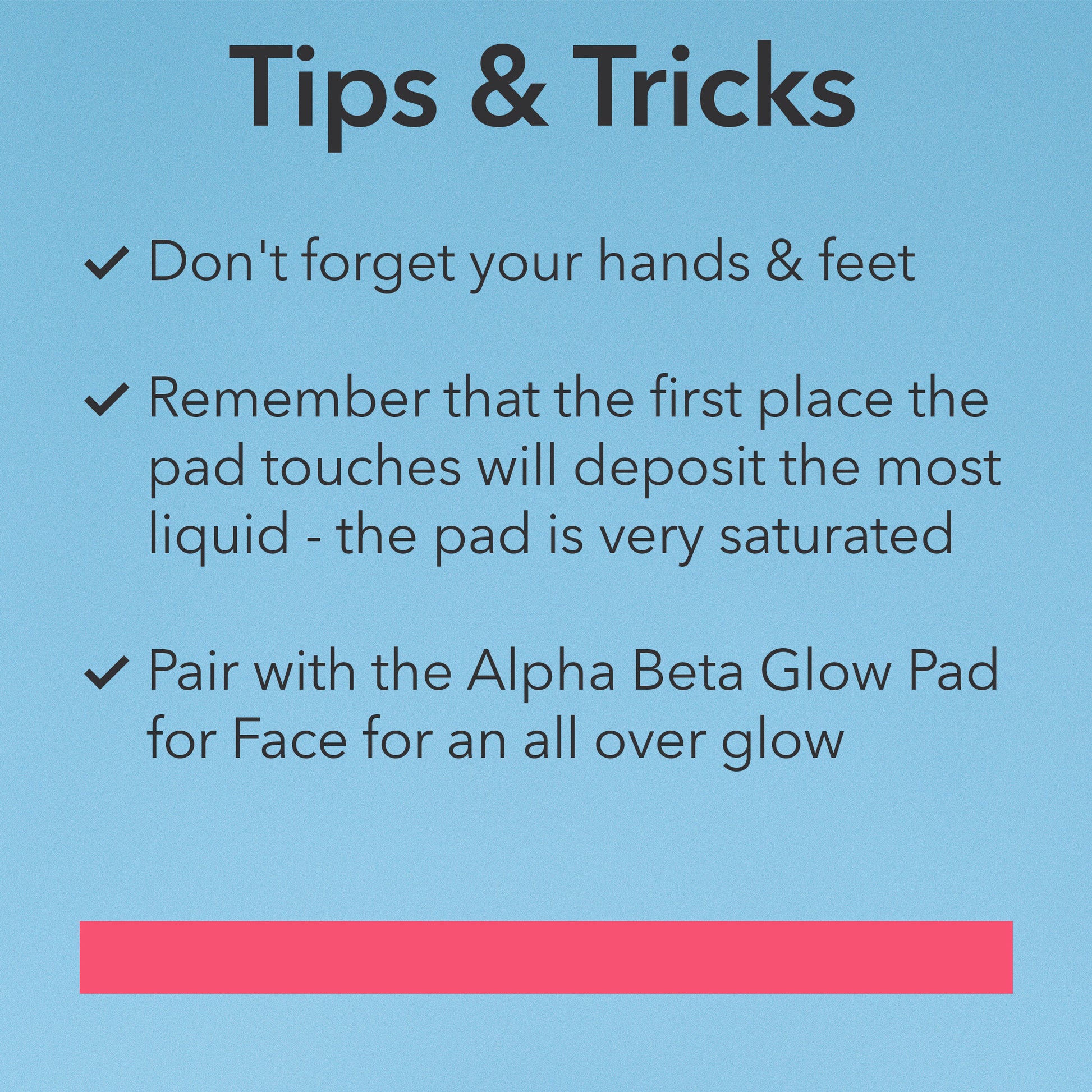 Exfoliate and glow in 1 step! Unfold towel and apply to body in circular motions, blending evenly until towel is dry, starting with lower body and working your way up. Once all areas are covered, lightly apply any excess product to hands and feet. Wash palms immediately after use. Color begins to develop within 1 hour of application. No rinse needed. Apply 1-2 times weekly to achieve your desired buildable glow & maximize results.