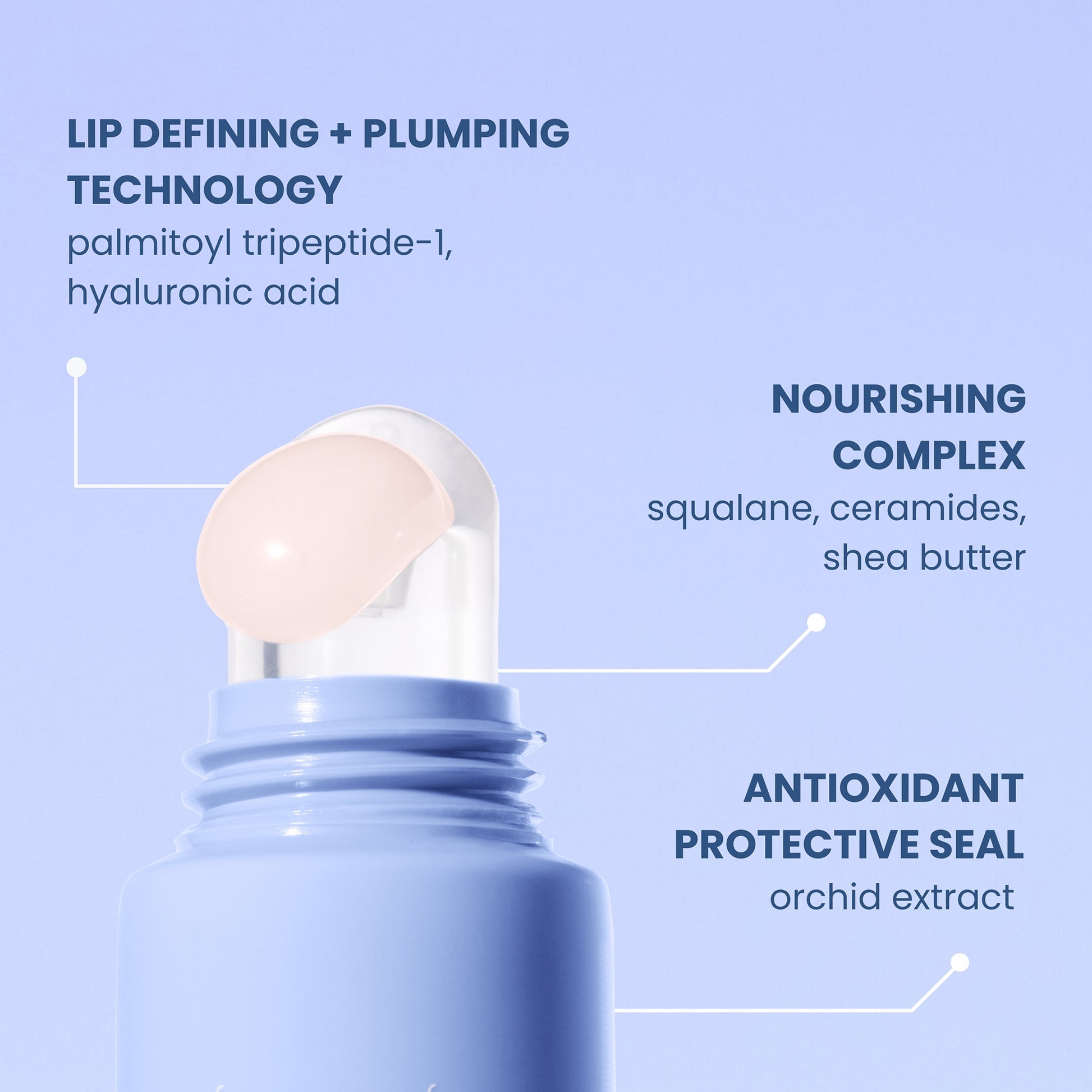 - Lip defining + plumping technology: palmitoyl tripeptide-1, hyaluronic acid