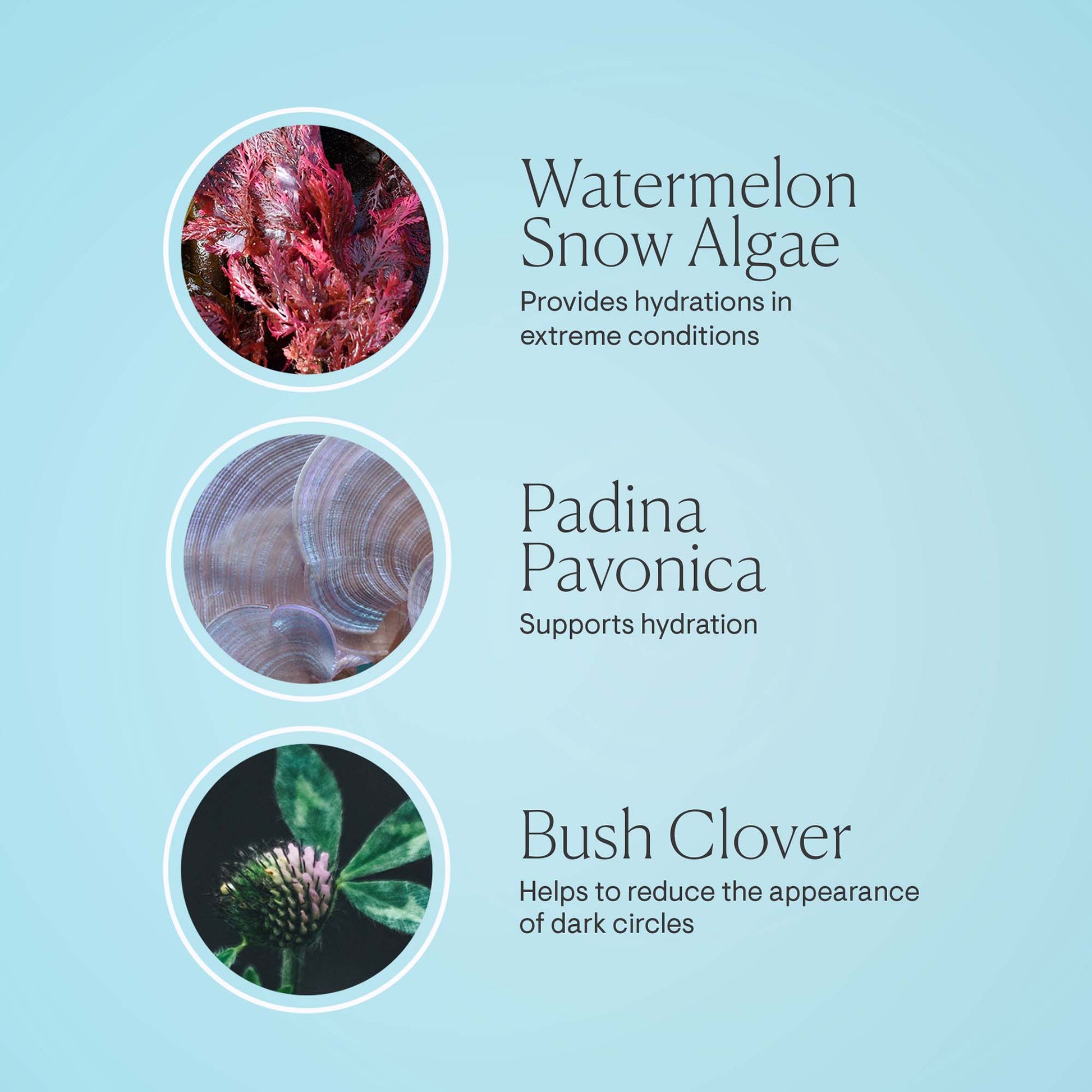 - Watermelon Snow Algae: deeply hydrates and reduces visible effects of tension and strain
