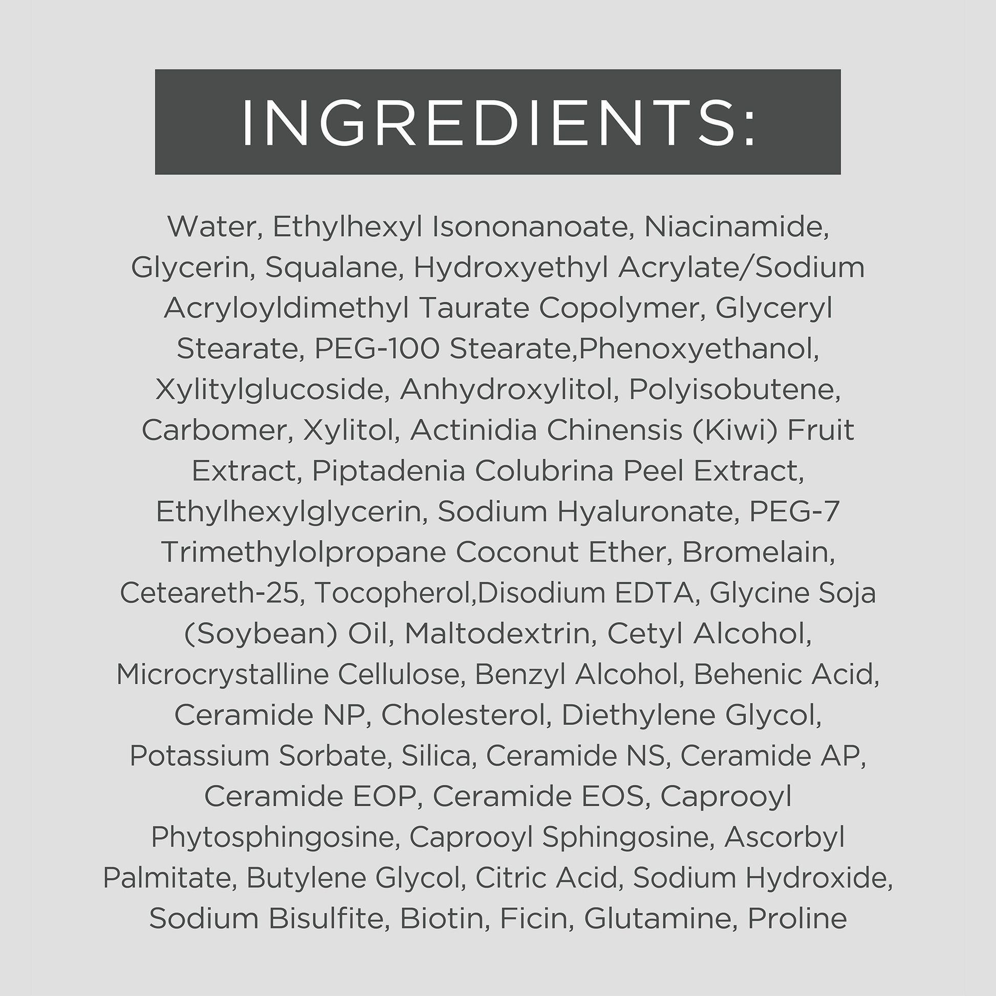 Purified Water, Ethylhexyl Isononanoate, Niacinamide, Glycerin, Glyceryl Stearate, PEG-100 Stearate, Dimethicone, Ceramide NP, Cholesterol, Ceramide EOS, Cetyl Alcohol, Ceramide NS, Ceteareth-25, Ceramide EOP, Caprooyl Sphingosine, Caprooyl Phytosphingosine, Ceramide AP, Hyaluronic Acid, Hydroxyethyl Acrylate/ Sodium Acryloyldimethyl Taurate Copolymer, Xylitylglucoside, Squalane, Anhydroxylitol, PEG-7 Trimethylolpropane Coconut Ether, Polyisobutene, Piptadenia Colubrina Peel Extract, Actinidia Chinensis (Kiwi) Fruit Extract , Bromelain, Tocopherol, Xylitol, Ficin, Glutamine, Biotin, Proline, Behenic Acid, Carbomer, Citric Acid, Sodium Hydroxide, Butylene Glycol, Benzyl Alcohol, Potassium Sorbate, Phenoxyethanol, Hexadecanol, Sodium Bisulfite, Disodium EDTA.