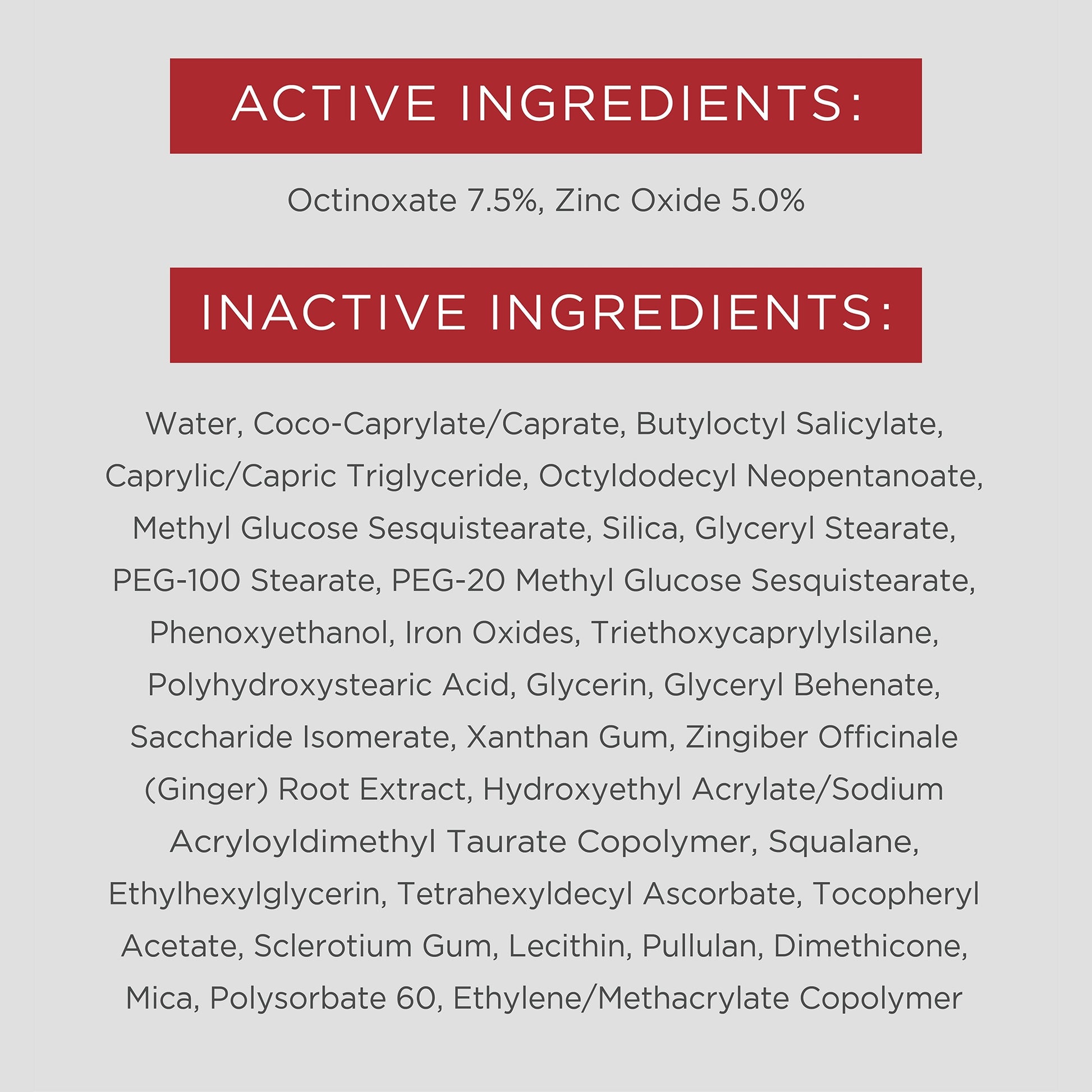 Inactive Ingredients: Water, CocoCaprylate/Caprate, Butyloctyl Salicylate, Octyldodecyl Neopentanoate, Caprylic/Capric Triglyceride, Methyl Glucose Sesquistearate, Glyceryl Stearate, PEG-100 Stearate, PEG-20 Methyl Glucose Sesquistearate, Silica, Phenoxyethanol, Triethoxycaprylylsila Polyhydroxystearic Acid, Glycerin, Saccharide Isomerate, Glyceryl Behenate, Xanthan Gum, Zingiber Officinale (Ginger) Root Extract, Hydroxyethyl Acrylate/Sodium Acryloyldimethyl Taurat Copolymer, Squalane, Ethylhexylglycerin, Tocopheryl Acetate, Tetrahexyldecyl Ascorbate, Sclerotium Gum, Lecithin, Pullulan,Dimethicone, Polysorbate 60, Ethylene/Methacrylate Copolymer, Sorbitan Oleate, Mica, Iron Oxides.