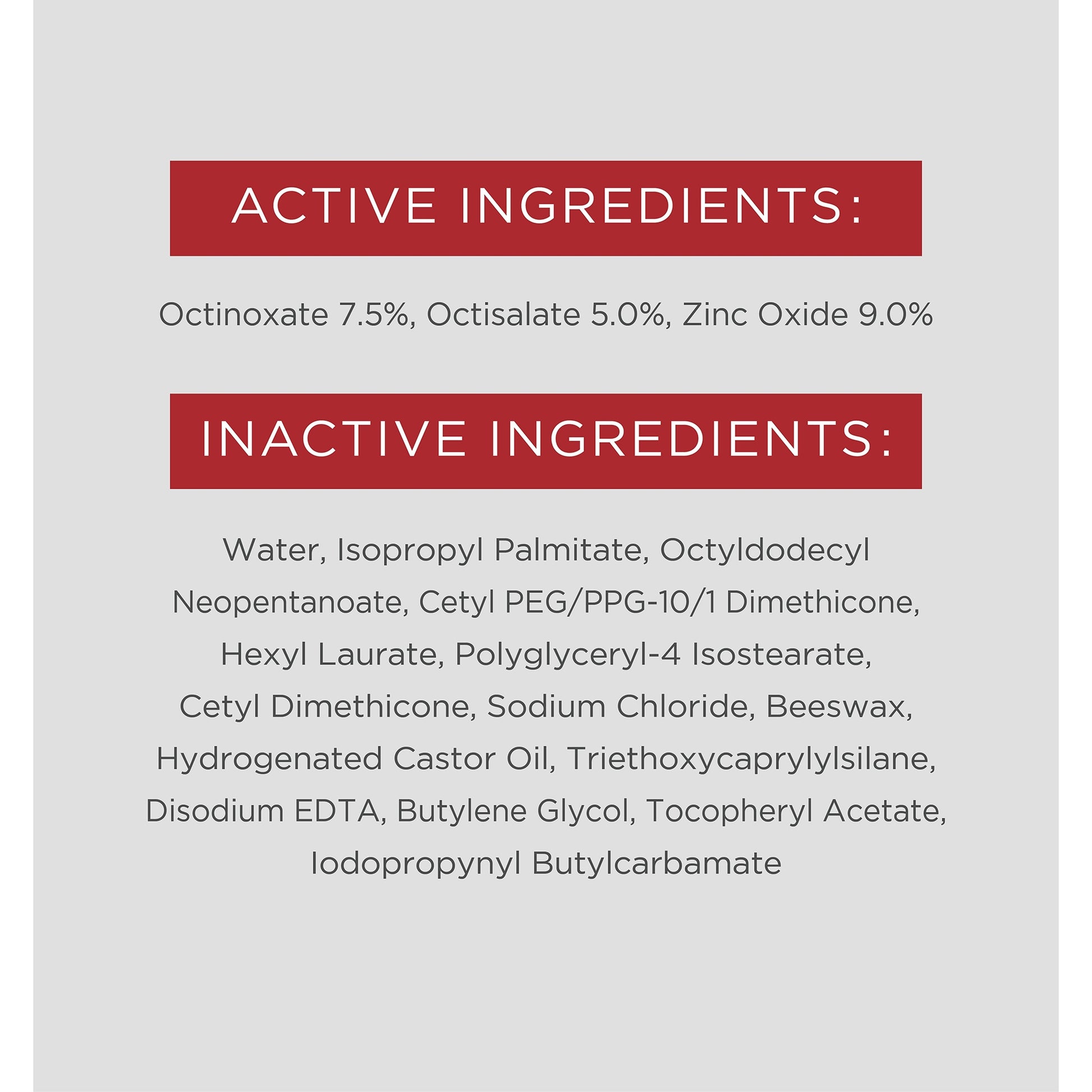 Active Ingredients: 9.0% Zinc oxide, 7.50% Octinoxate, 5.0% Octisalate
