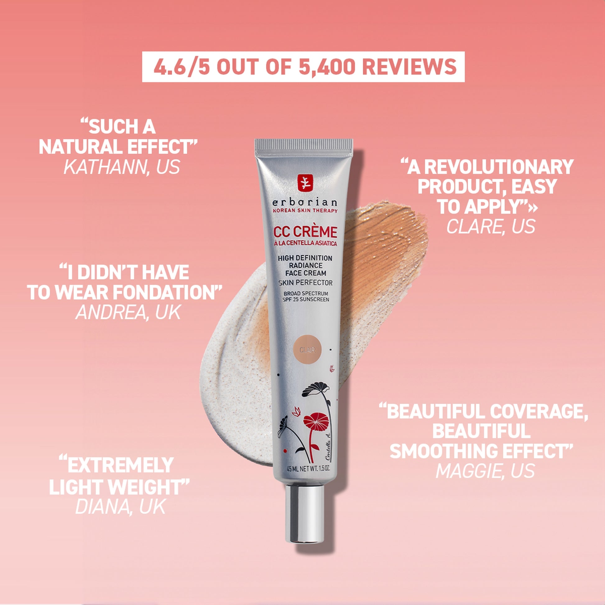 Erborian's CC Cream delivers light coverage that enhances your skin's natural radiance while blurring the appearance of pores and imperfections. The formula's initial white pigments transform to match your skin tone when blended into the skin for a seamless shade match and a more even-looking complexion. Enriched with Centella Asiatica, this CC Cream helps hydrate and protect your skin while broad-spectrum protection helps shield your skin from harmful UVA/UVB rays that cause dark spots and wrinkles.