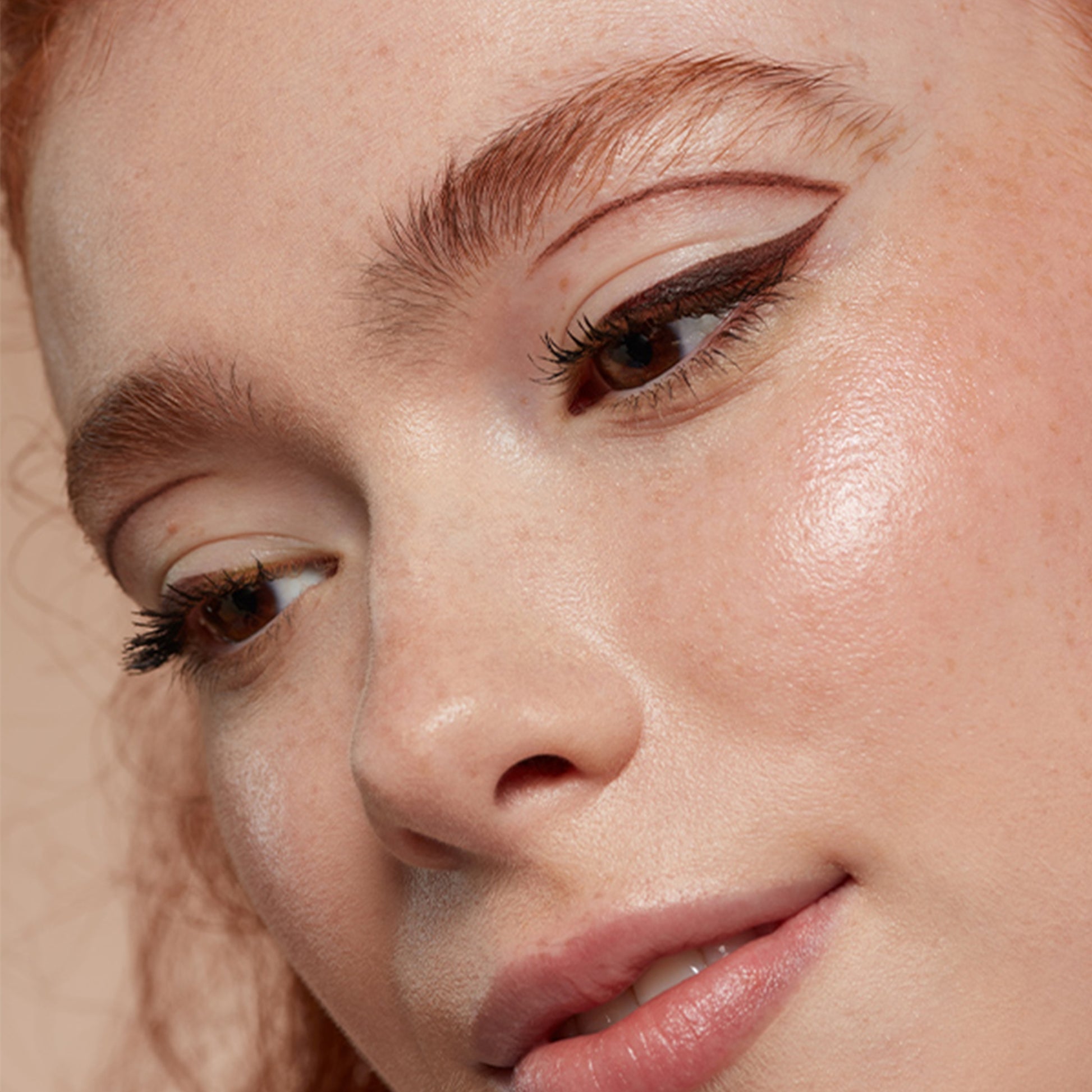 Shake before use. For a cat-eye look, sweep along lash line stopping at the outer corner. Draw a line from the outer corner towards the tail of the brow, stopping when your wing is just the right size for you. From the end of the wing, glide the brush tip back to meet your lash line.