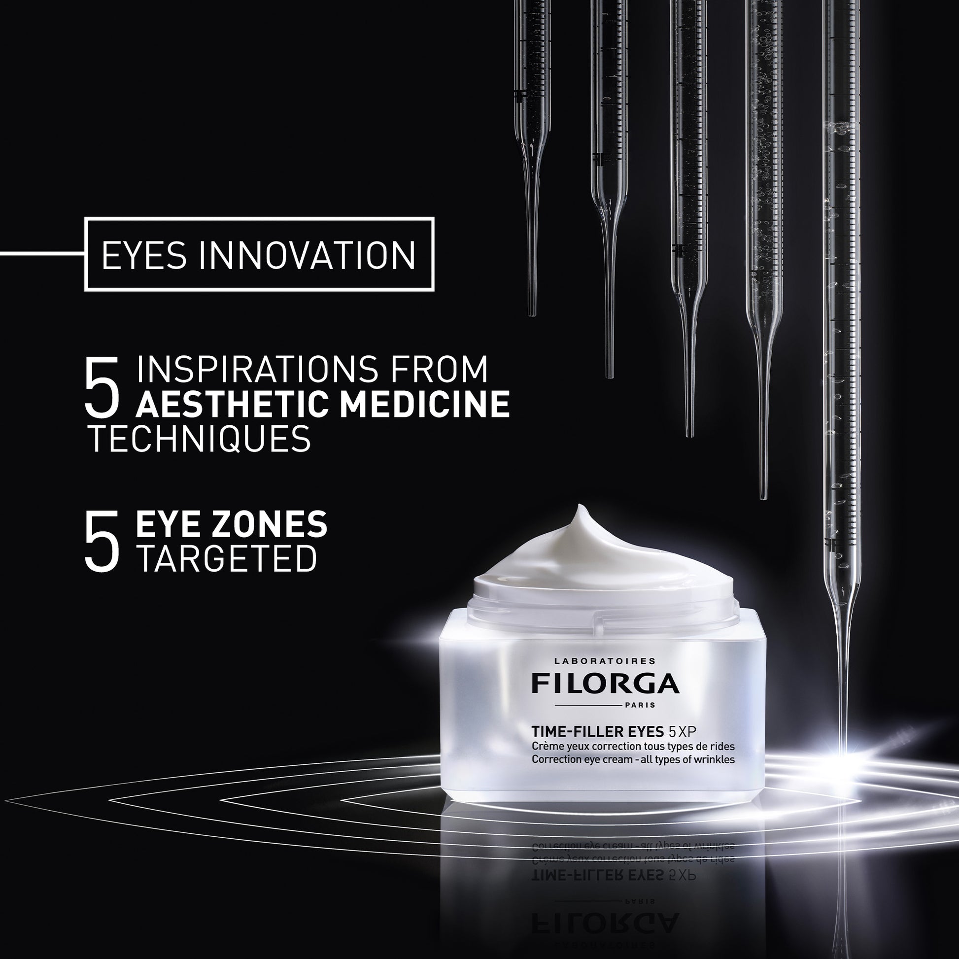 - Its formula is inspired by FILORGA's expertise in aesthetic medicine to correct all types of wrinkles around the eye area as well as dark circles. Thanks to its high-precision cocktail of active ingredients [relaxing peptides + plant stem cells + NCEF], it is used to relax features so as to reduce frown lines without freezing facial expressions. It also provides a smoothing action to crow's feet without irritating the skin, captures water and intensely plumps the skin to smooth under-eye wrinkles. At the same time, TIME-FILLER EYES 5XP acts to firm the upper eyelids as well as to fight dark circles.