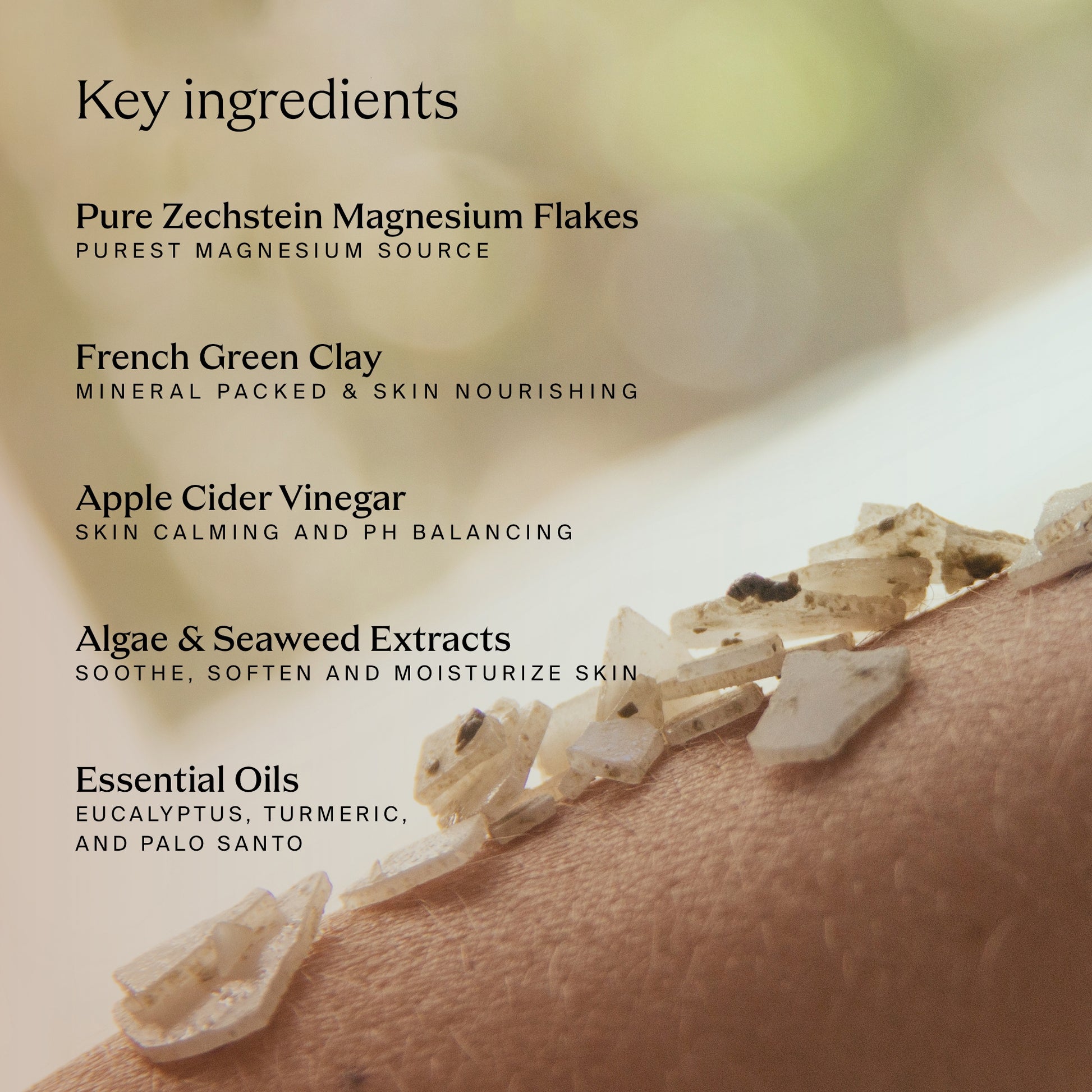 Zechstein Magnesium chloride flakes, montmorillonite (french green clay), Tapioca maltodextrin, apple cider vinegar, helianthus annuus (sunflower) seed oil, fucus vesiculosus (seaweed) extract, Laminaria Digitata (brown algae) extract. Less than 2% of essential oil blend Eucalyptus Globulus, Origanum Majorana, curcuma Longa, Bursera Graveolens