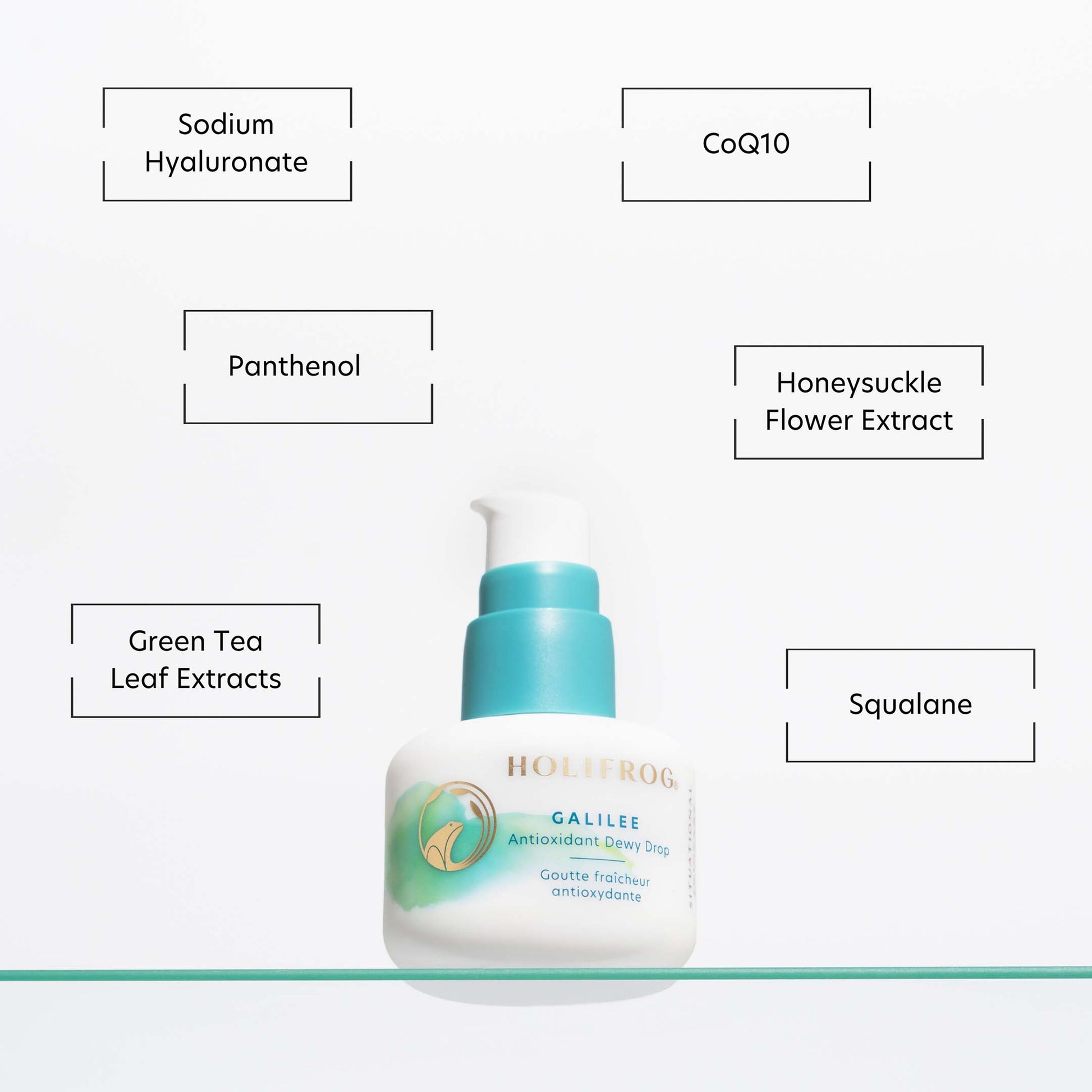 HoliFrog's Galilee Antioxidant Dewy Drop moisturizes dry or dehydrated skin for a complexion that looks fresh, bouncy, and soft. Lightweight with a silky texture, this hydrating emulsion is infused with moisture-attracting humectants, vitamins and antioxidants from plant-based oils and skin-strengthening botanical extracts to soothe, seal in moisture and balance your skin.