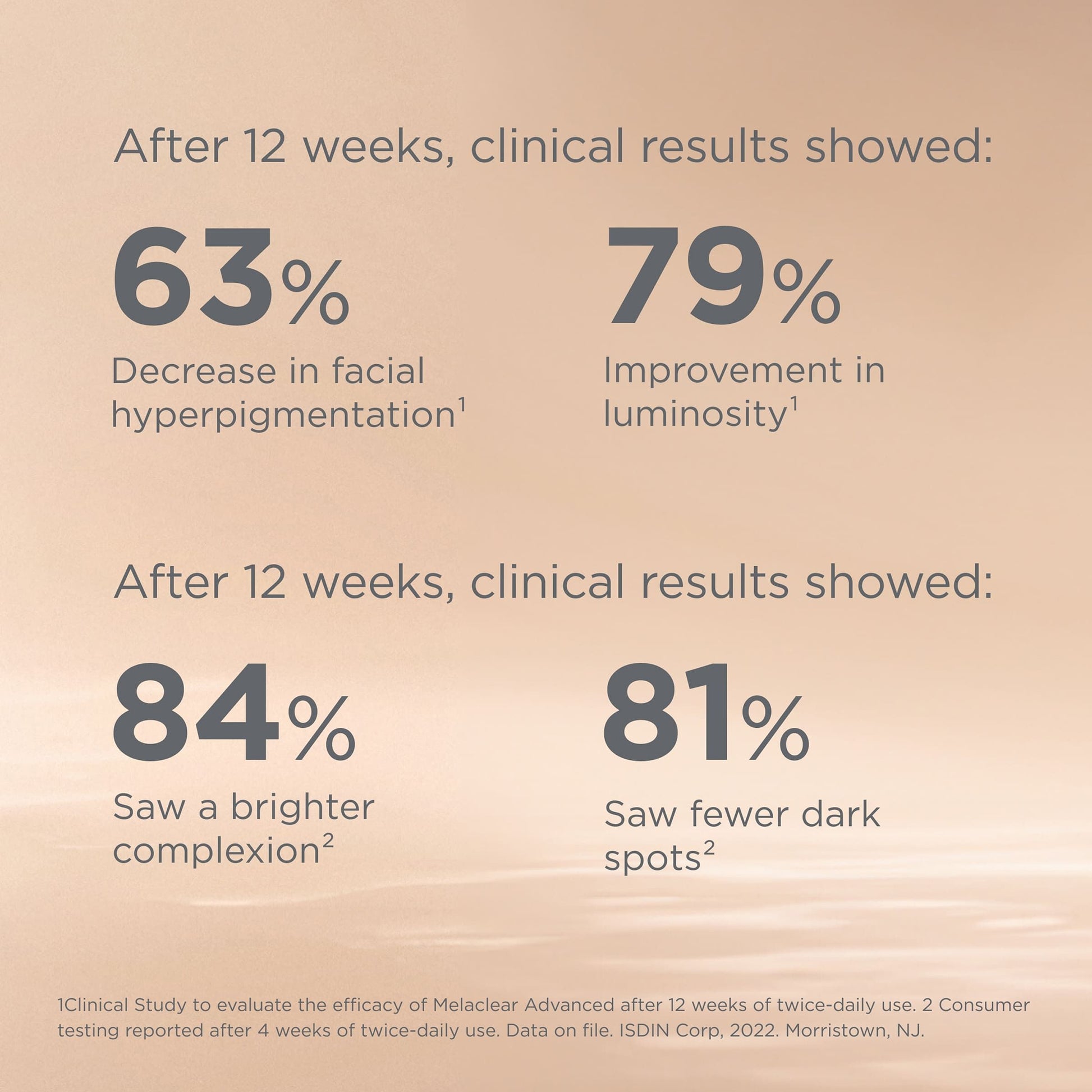 Transform your skin with Melaclear Advanced Pigment-Correcting Serum. Designed to reduce dark spots and discoloration, this powerful serum delivers noticeable improvements in as little as two weeks, with exceptional results within 12 weeks. Enjoy a luminous, even complexion thanks to a potent blend of key ingredients, including tranexamic acid, niacinamide, and our advanced Spot Corrector Complex.