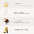 (Carnauba) Wax, PVP, Ammonium Acrylates Copolymer, Alcohol, Aminomethyl Propanol, Caprylyl Glycol, 1,2-Hexanediol, Hydroxyacetophenone, Sodium Dehydroacetate, Butylene Glycol, Laureth-21, Glycerin, Trideceth-6 Phosphate, Dipropylene Glycol, Glycosphingolipids, Artocarpus Heterophyllus Fruit Extract, Glyceryl Caprylate, Lactobacillus/Tomato Fruit Ferment Extract, Keratin Amino Acids, Oryza Sativa (Rice) Extract, Leuconostoc/Radish Root Ferment Filtrate, Lactobacillus Ferment, Acyl Coenzyme A Desaturase.