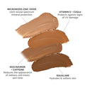 Actives: Titanium Dioxide 2.10% / Zinc Oxide 17.00% Dimethicone, Caprylic/Capric Triglyceride, Dimethicone Crosspolymer, Dimethicone/ Vinyl Dimethicone Crosspolymer, Butyloctyl Salicylate, Glyceryl Isostearate, Polysilicone-15, Niacinamide, Caffeine, Ubiquinone (CoQ10), Tetrahexyldecyl Ascorbate (Vitamin C), Tocopheryl Acetate (Vitamin E), Squalane, Punica Granatum Extract (Pomegranate), Vaccinium Macrocarpon (Cranberry) Fruit Extract, Camellia Sinensis Leaf Extract (Green Tea), Cyclotetrasiloxane, Silica, PEG/PPG-18/18 Dimethicone, Isoceteth-10, Polyhydroxystearic Acid, Triethoxycaprylylsilane, Iron Oxides (CI 77491, CI 77492, CI 77499)