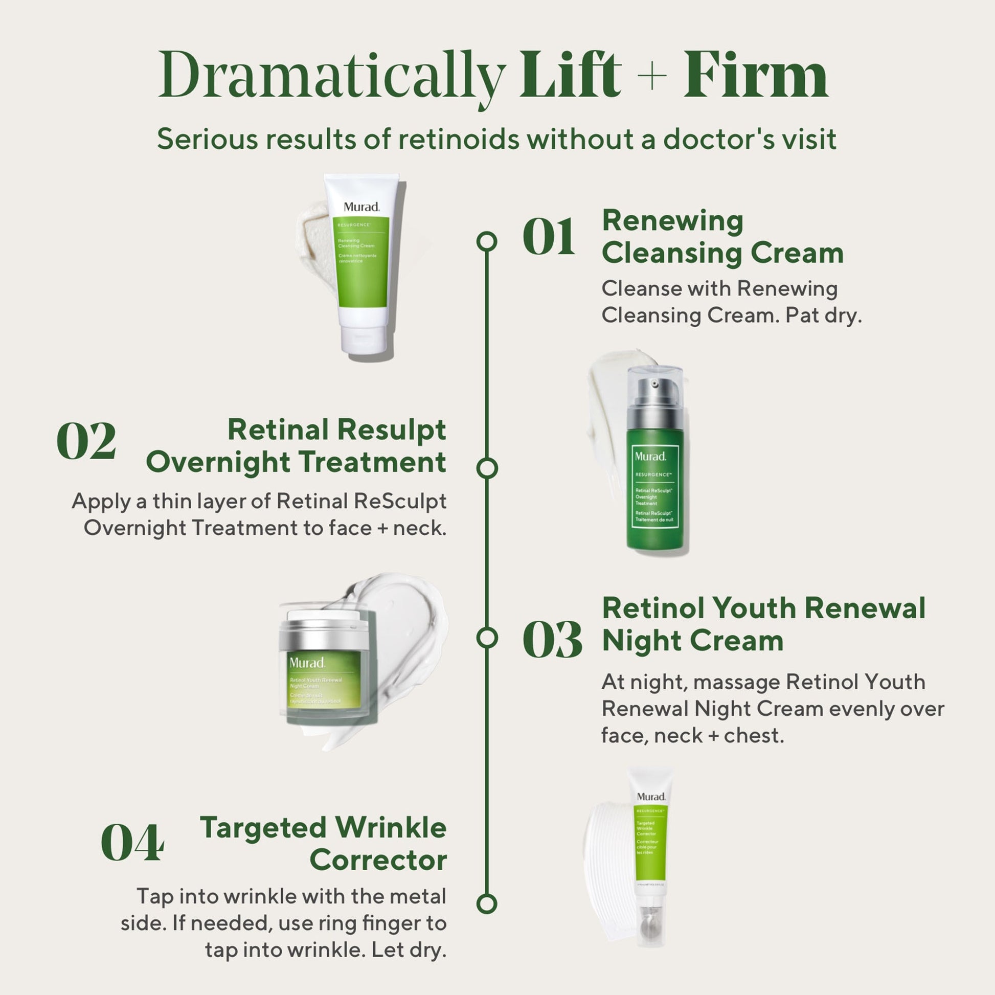 - Apply a thin layer of Retinal ReSculpt Overnight Treatment to face and neck.