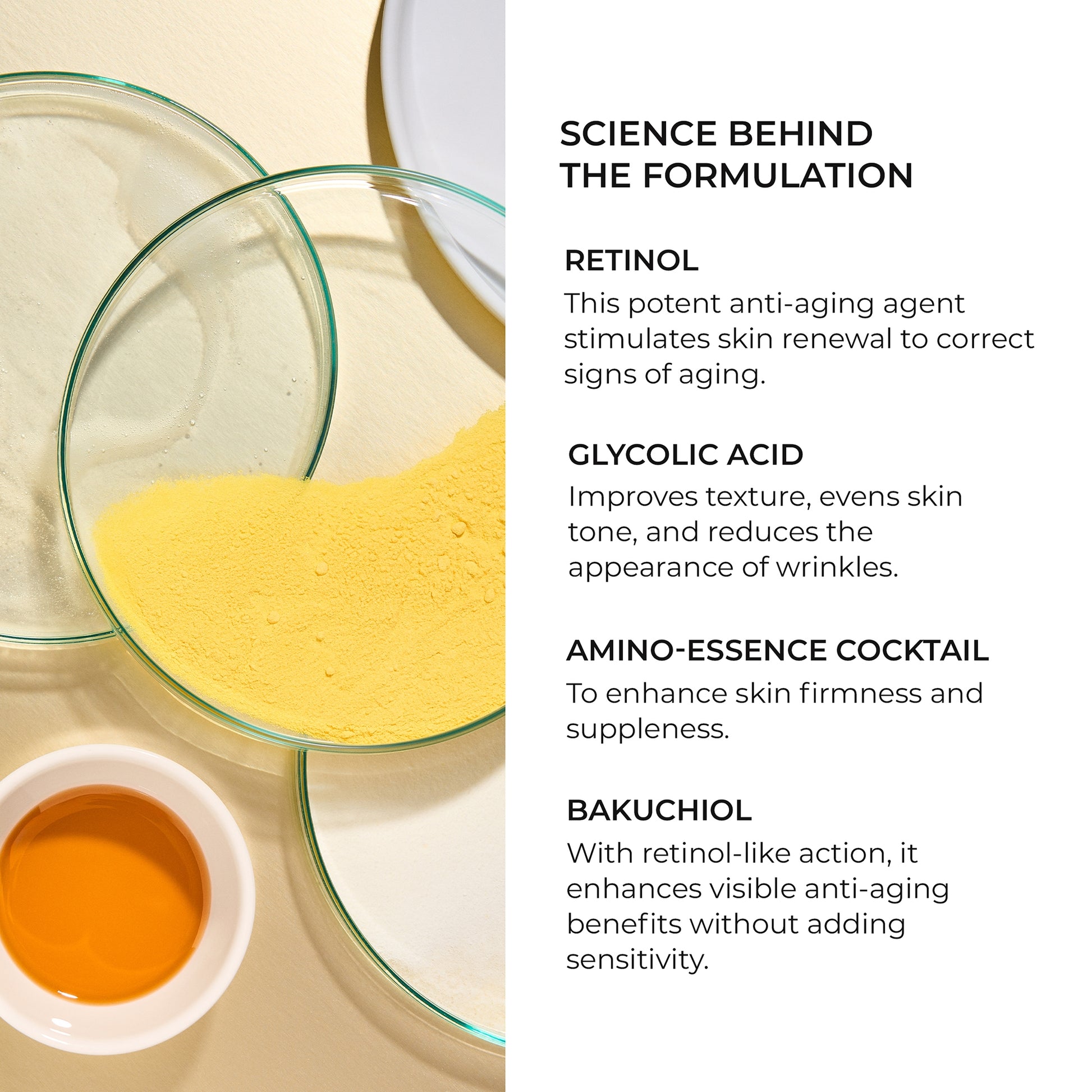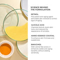 Retinol is enhanced by bakuchiol to improve skin renewal. Both contribute to the production of collagen, elastin, and hyaluronic acid-each helping to address the appearance of wrinkles.