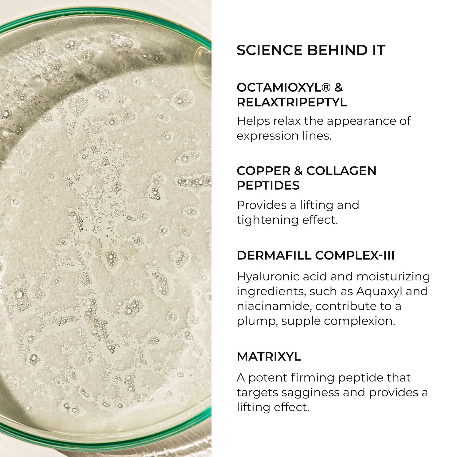 - Copper and Collagen Peptides: provide a lifting and tightening effect that reduces the look of sagging skin