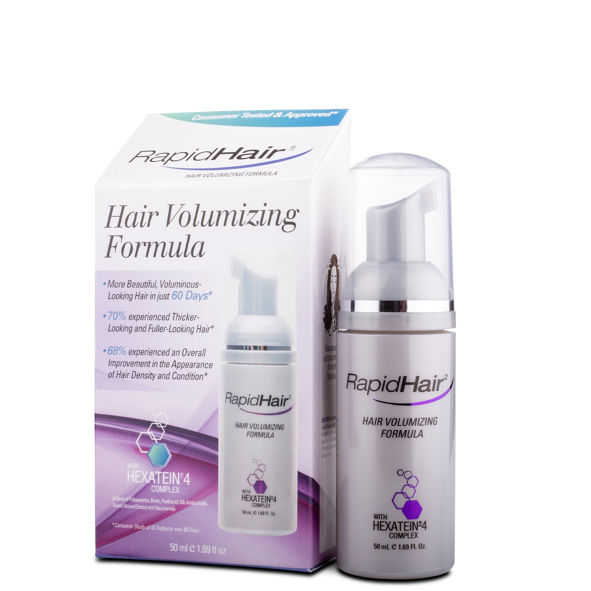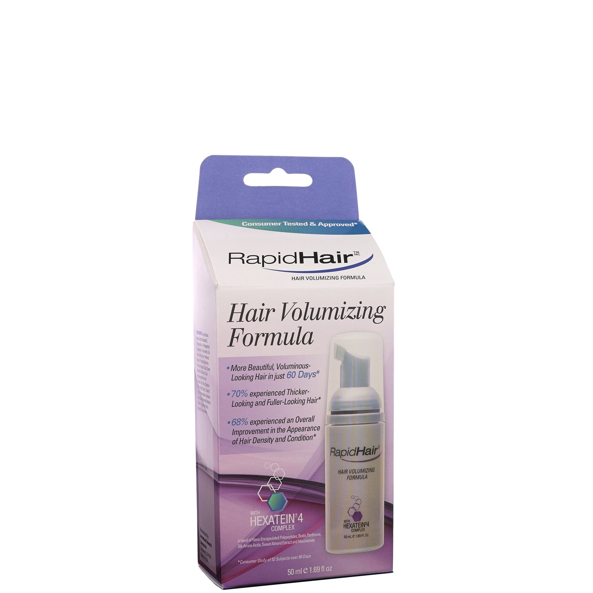 RapidHair is formulated with Hexatein 4 Complex, a proprietary blend of hair enhancing, nourishing and revitalizing ingredients, specifically designed to help revive the appearance of hair and invigorate the scalp. This blend, unique to RapidHair, helps awaken the youthful softness and sheen of hair, enhance its resilience, and promote the appearance of volume and brilliance.