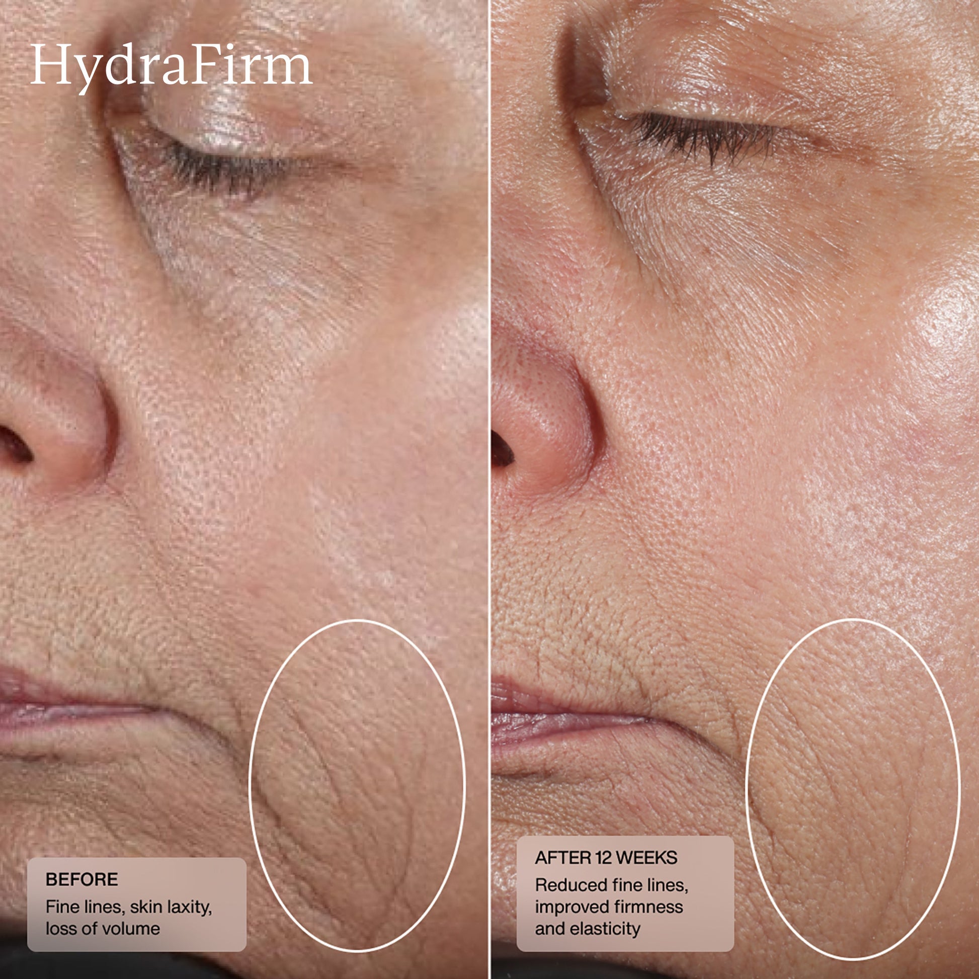 In a 12-week Clinical Study on subjects with moderate-to-severe photodamage, 75% of subjects agreed HydraFirm made their skin look plumper after 8 weeks, 79% of subjects showed improvement in skin firmness after 12 weeks and 79% of subjects showed improvement in skin elasticity after 8 weeks and agreed HydraFirm made their skin smoother and softer.