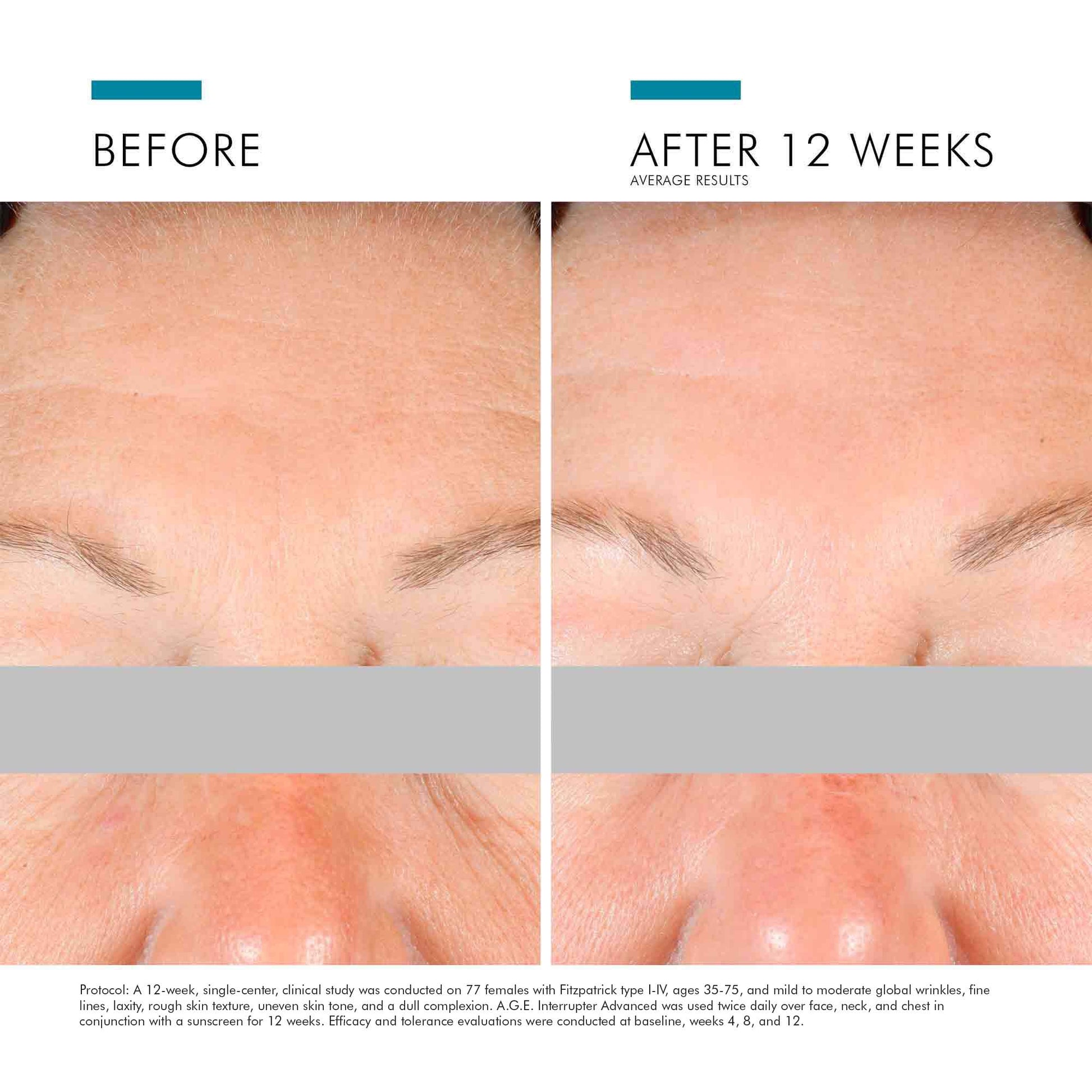 Protocol: A 12-week, single-center, clinical study was conducted on 77 females with Fitzpatrick type I-VI, ages 35-75, and mild to moderate global wrinkles, fine lines, laxity, rough skin texture, uneven skin tone, and a dull complexion. A.G.E. Interrupter Advanced was used twice daily over face, neck, and chest in conjunction with a sunscreen for 12 weeks. Efficacy and tolerance evaluations were conducted at baseline, weeks 4, 8, and 12.