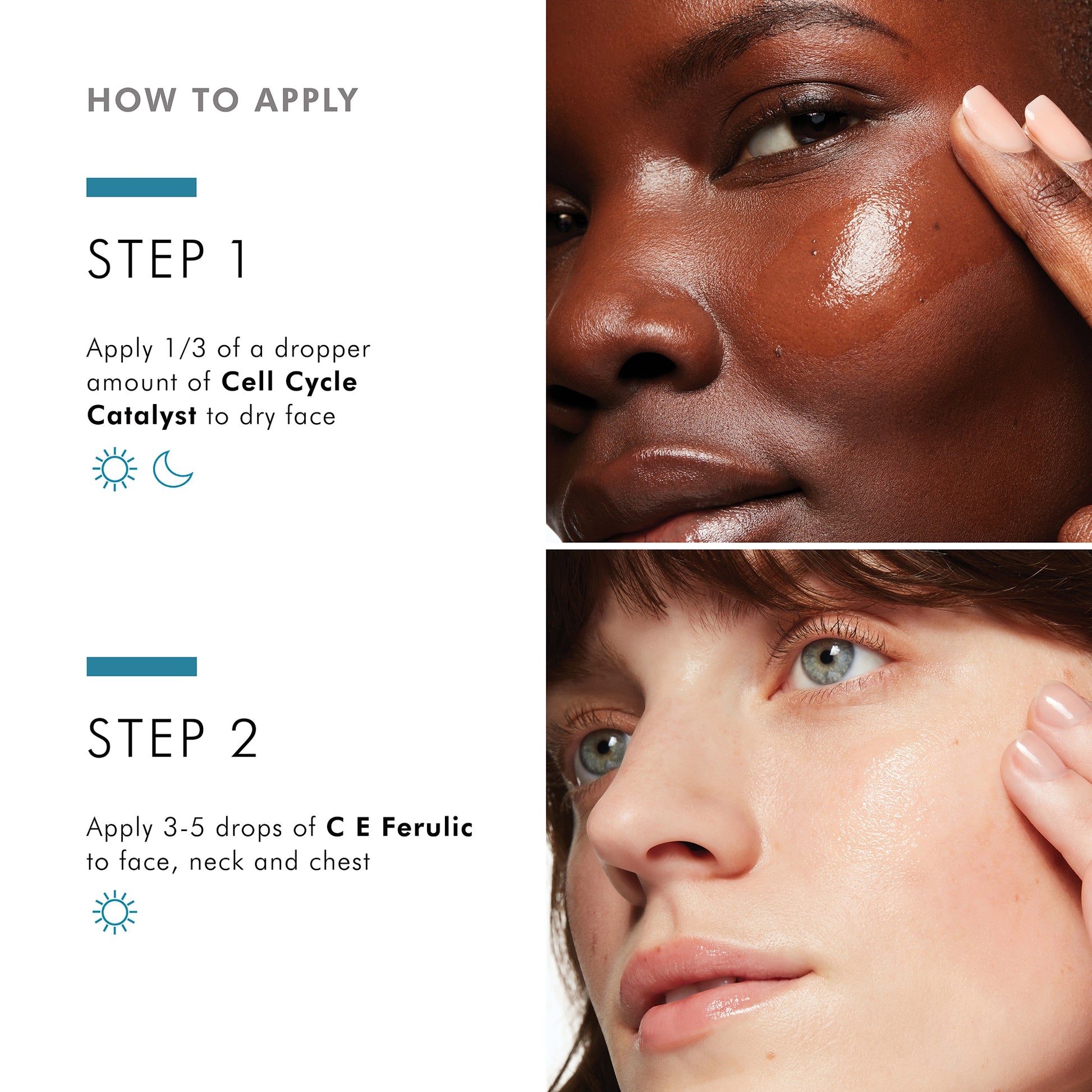 Apply 4-5 drops of CE Ferulic to a dry face, neck, and chest before other skincare products.