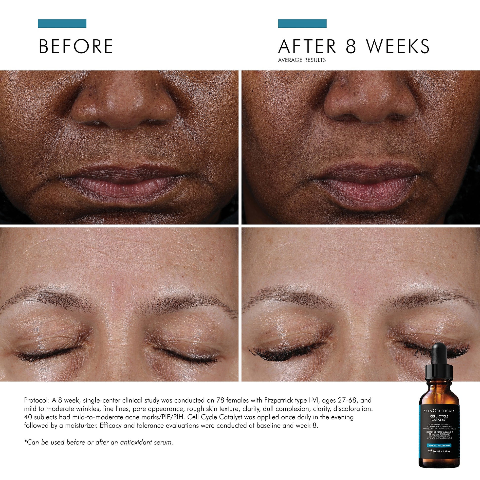 After 8 weeks, Cell Cycle Catalyst noticeably improved attributes associated with skin aging, including fine lines, discoloration, and radiance in multiple facial zones.