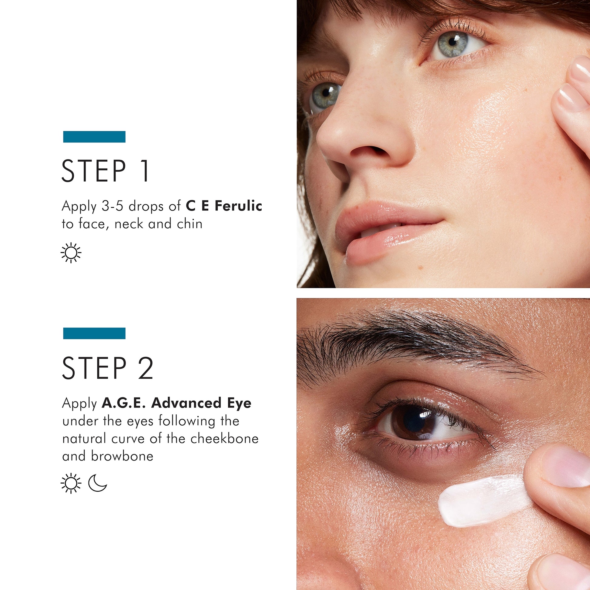 Follow with SkinCeuticals A.G.E. Advanced Eye cream, which can be applied during your morning and nigthtime routine. Apply under the eyes following the natural curve of the cheekbone and browbone. Do not apply directly to eyelids.