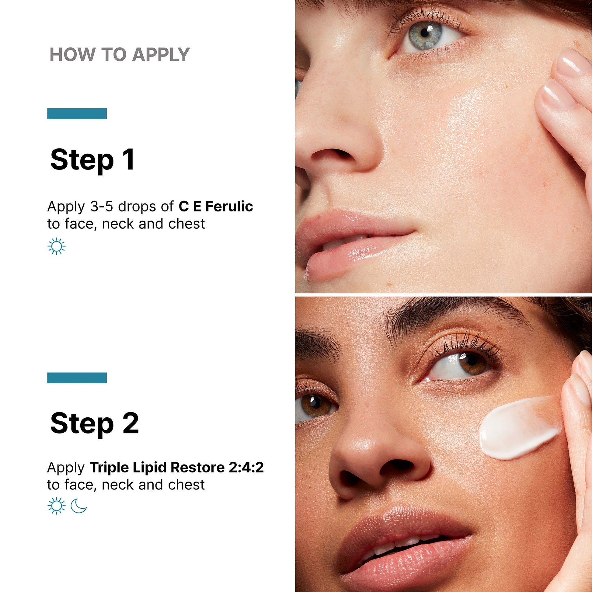 Follow with SkinCeuticals Triple Lipid Restore 2:4:2. Apply a small amount between fingertips, warm and melt the cream in circular motions. In the morning, complete your regimen with a SkinCeuticals broad-spectrum sunscreen.