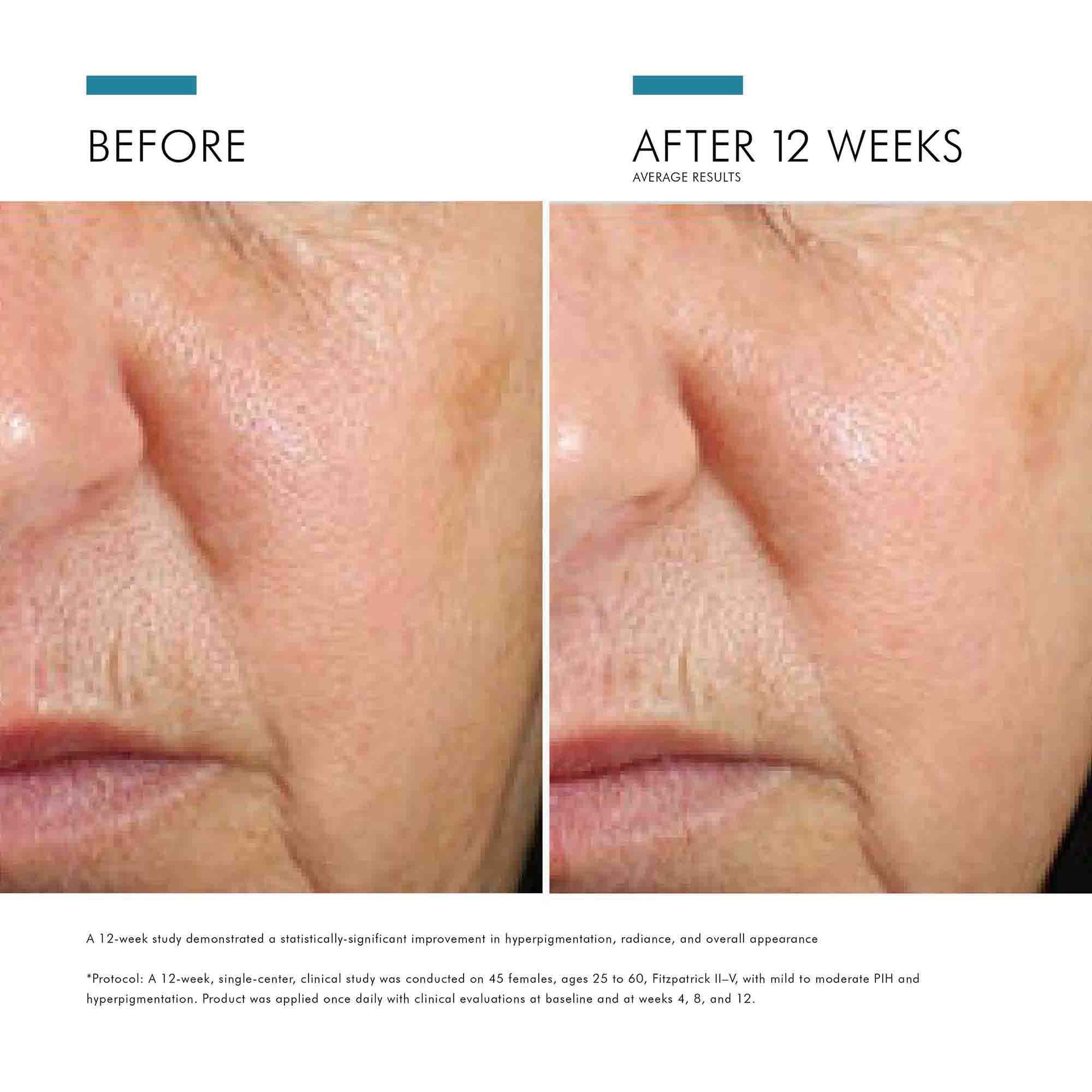 *Based on a 12-week, single-center, clinical study conducted on 44 females, ages 25 to 60, Fitzparick II-V, with mild to moderate PIH and hyperpigmentation. Daily Brightening UV Defense Sunscreen SPF 30 was applied to the face once every day during the morning prior to sun exposure with efficacy and tolerability evaluations conducted at baseline and at weeks 4,8 and 12.