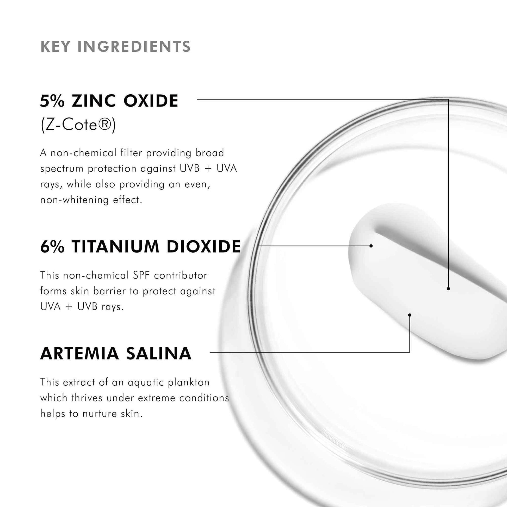 Inactive: Titanium Dioxide, Zinc Oxide, Water, Dimethicone, Isododecane, C12-15 Alkyl Benzoate Undecane, Triethylhexanoin, Isohexadecane, Nylon-12, Caprylyl Methicone, Butyloctyl Salicylate, Phenethyl Benzoate, Styrene/Acrylates Copolymer, Silica, Tridecane, Dicaprylyl Carbonate, Dicaprylyl Ether, Talc, Dimethicone/Peg-10/15 Crosspolymer, Aluminum Stearate, Pentylene Glycol, Peg-9 Polydimethylsiloxyethyl Dimethicone, Alumina, Polyhydroxystearic Acid, Phenoxyethanol, Magnesium Sulfate, Caprylyl Glycol, Peg-8 Laurate, Disteardimonium Hectorite, Tocopherol, Propylene Carbonate, Artemia Extract, Benzoic Acid, Peg-9.