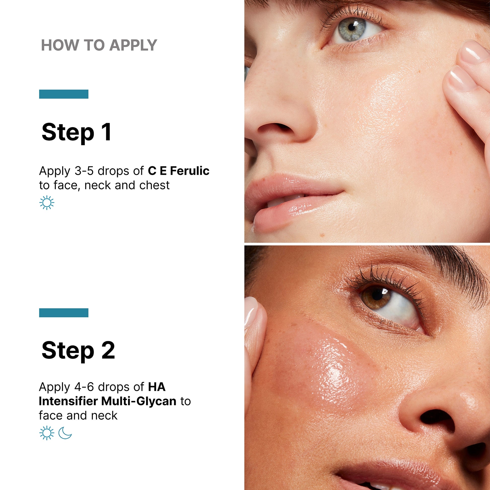 FINISH: In the morning, apply 4-5 drops of CE Ferulic to a dry face, neck, and chest to firm and brighten your skin. Next, apply 4-6 drops of H. A. Intensifier Multi-Glycan to face and neck to plump and hydrate. Complete your routine with your favorite SkinCeuticals sunscreen.