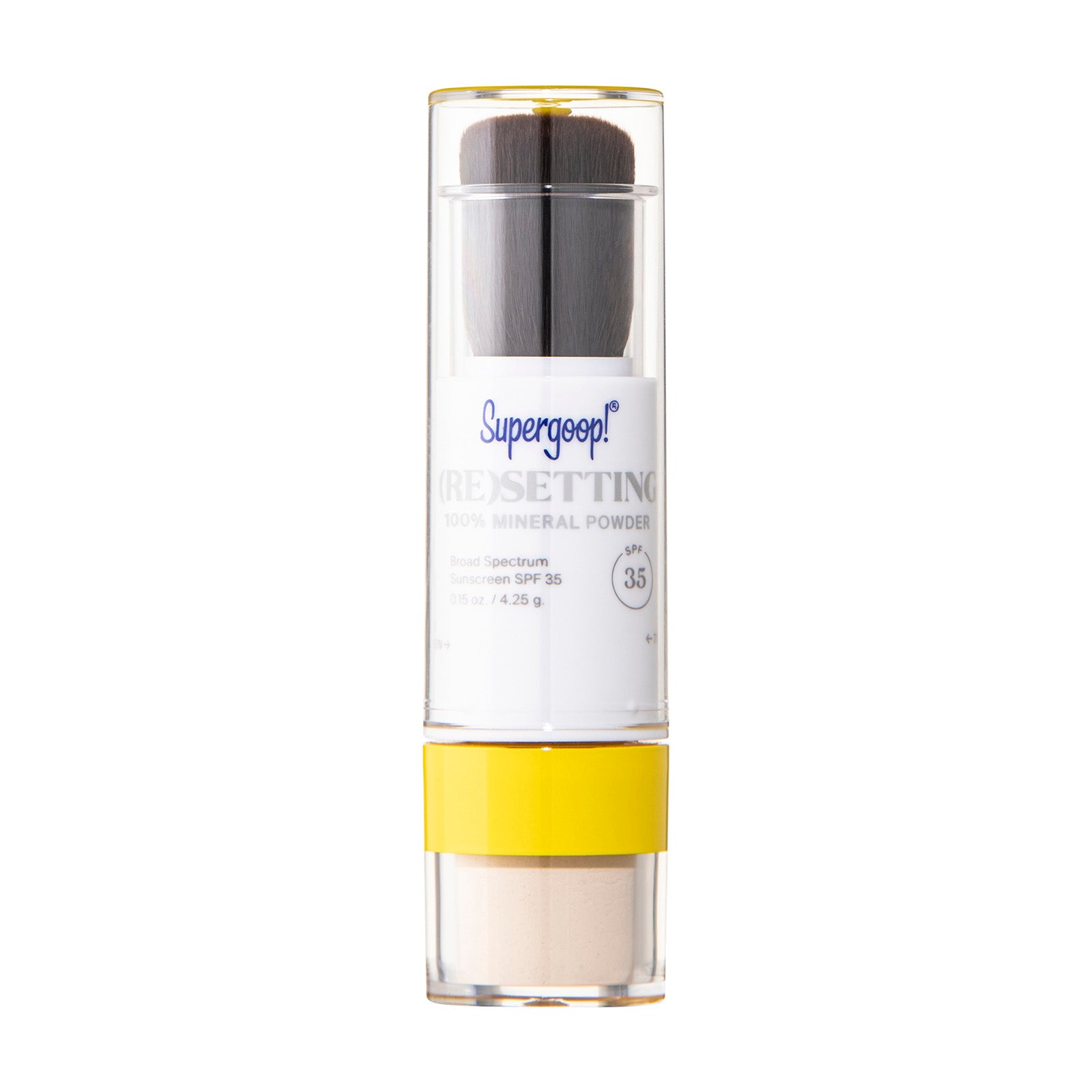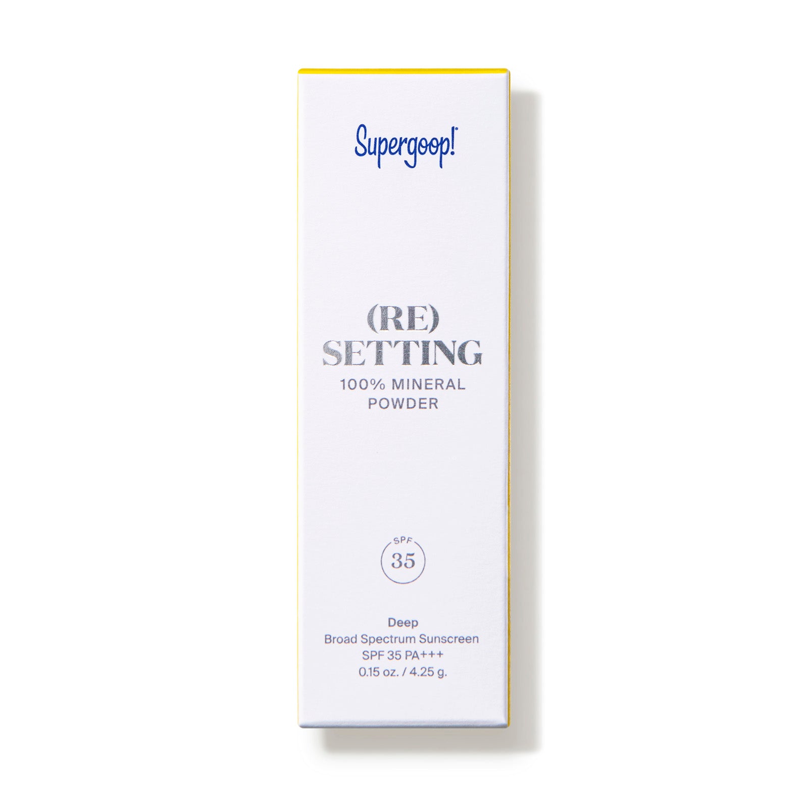 Supergoop!® (Re)setting 100% Mineral Powder SPF 35 is a makeup setting powder that mattifies shine and sets makeup while also providing sun protection. Infused with ceramides and olive glycerides, this mineral powder helps replenish skin's barrier and reduce moisture loss while coated silica spheres create a soft-focus finish diffusing the appearance of pores. Brush it on throughout the day to reduce shine and reapply SPF.