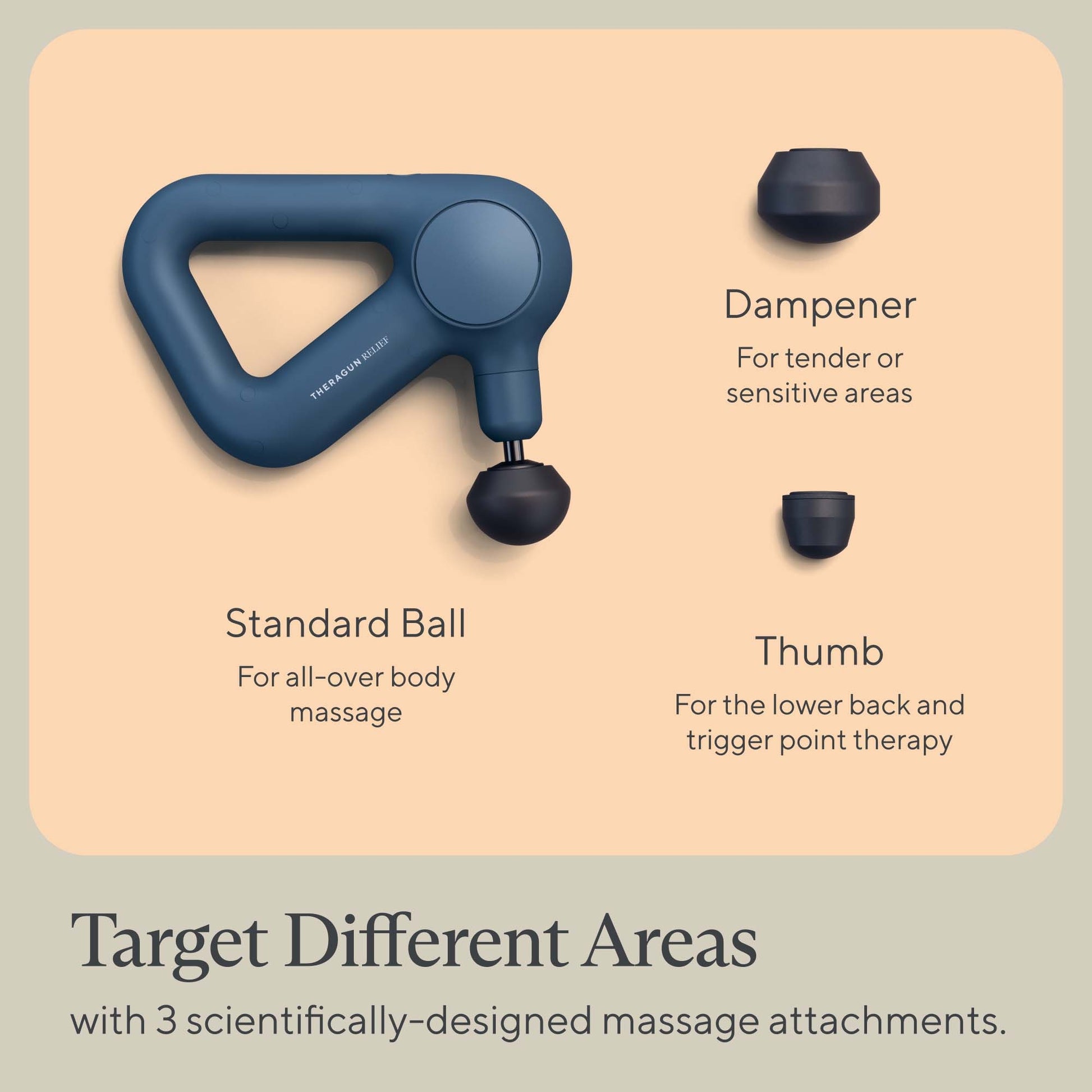 Theragun Relief includes 3 unique attachments, designed to target different types of muscle pain: