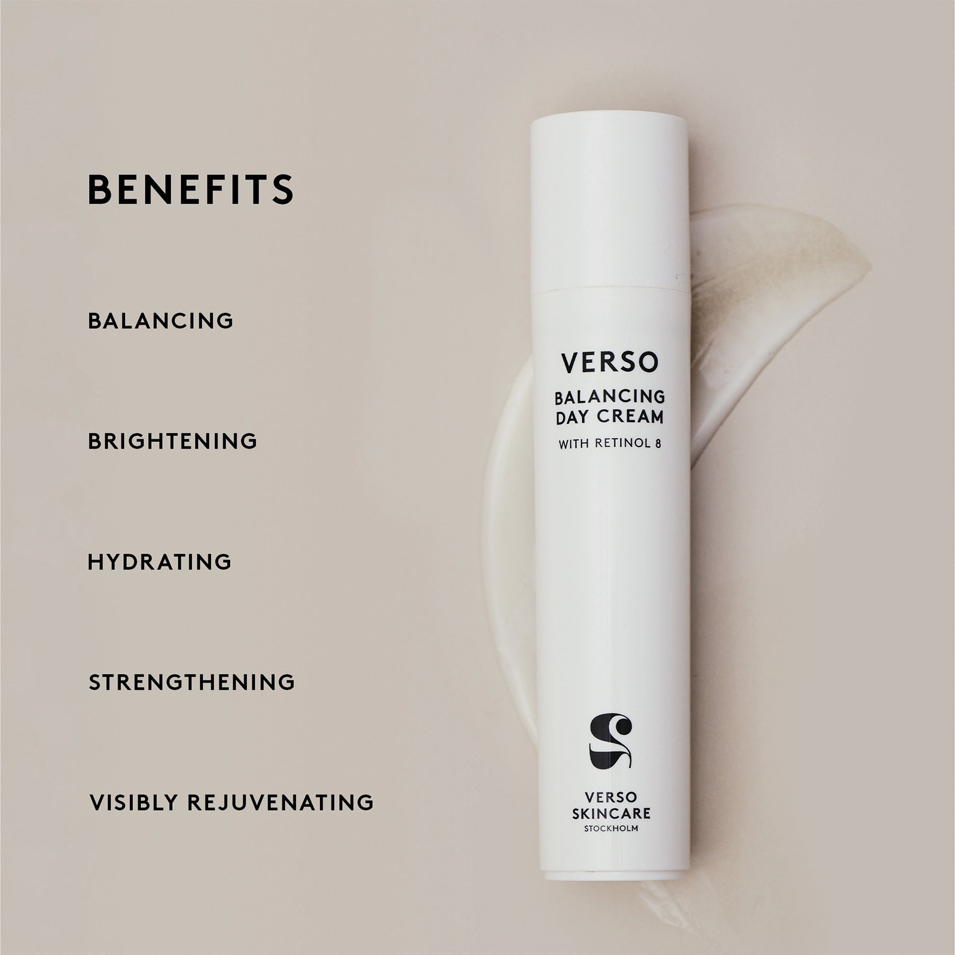 Verso Balancing Day Cream is a lightweight, retinol-based day cream designed to restore balance and deliver a calming, refreshing sensation to the skin. The advanced formula promotes an even skin tone and controls excess oil, helping to achieve a clear, smooth complexion without clogging pores. Its silky texture provides long-lasting hydration, strengthens the skin's natural barrier, and protects against the visible effects of environmental stressors with powerful antioxidants.
