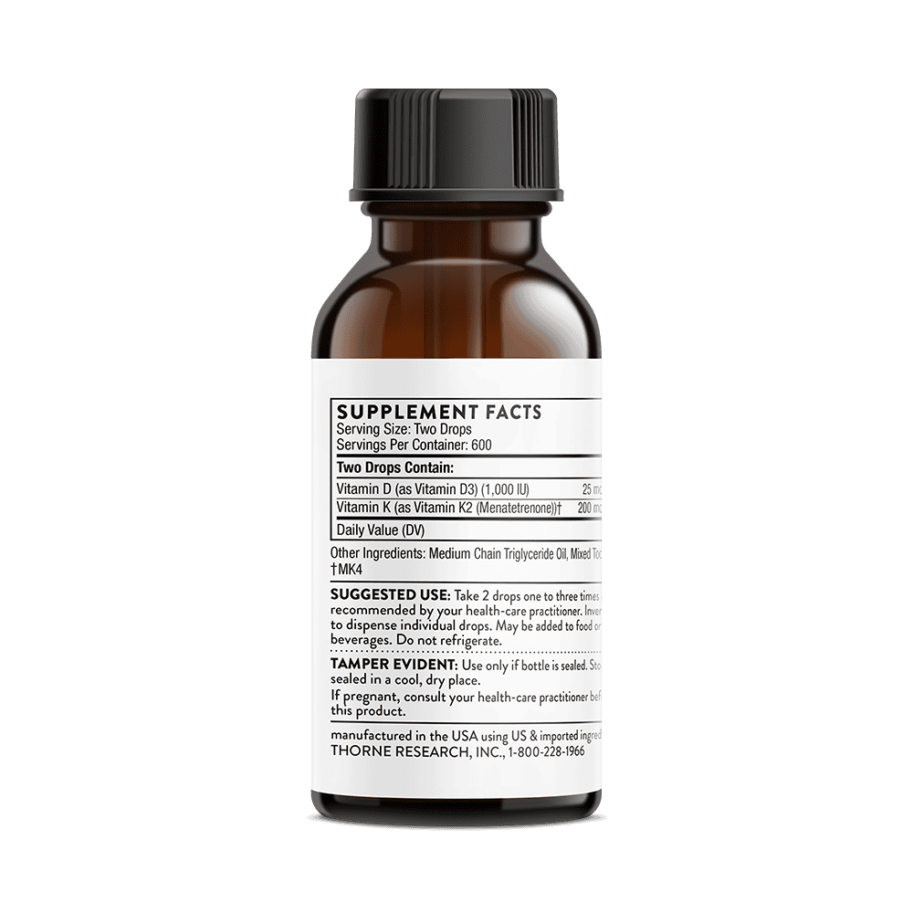 Thorne’s Vitamin D + K2 Liquid supports strong bones, immune health, and cardiovascular function. This synergistic formula combines vitamin D3 and K2 for enhanced absorption and effectiveness delivering greater health benefits than either nutrient alone